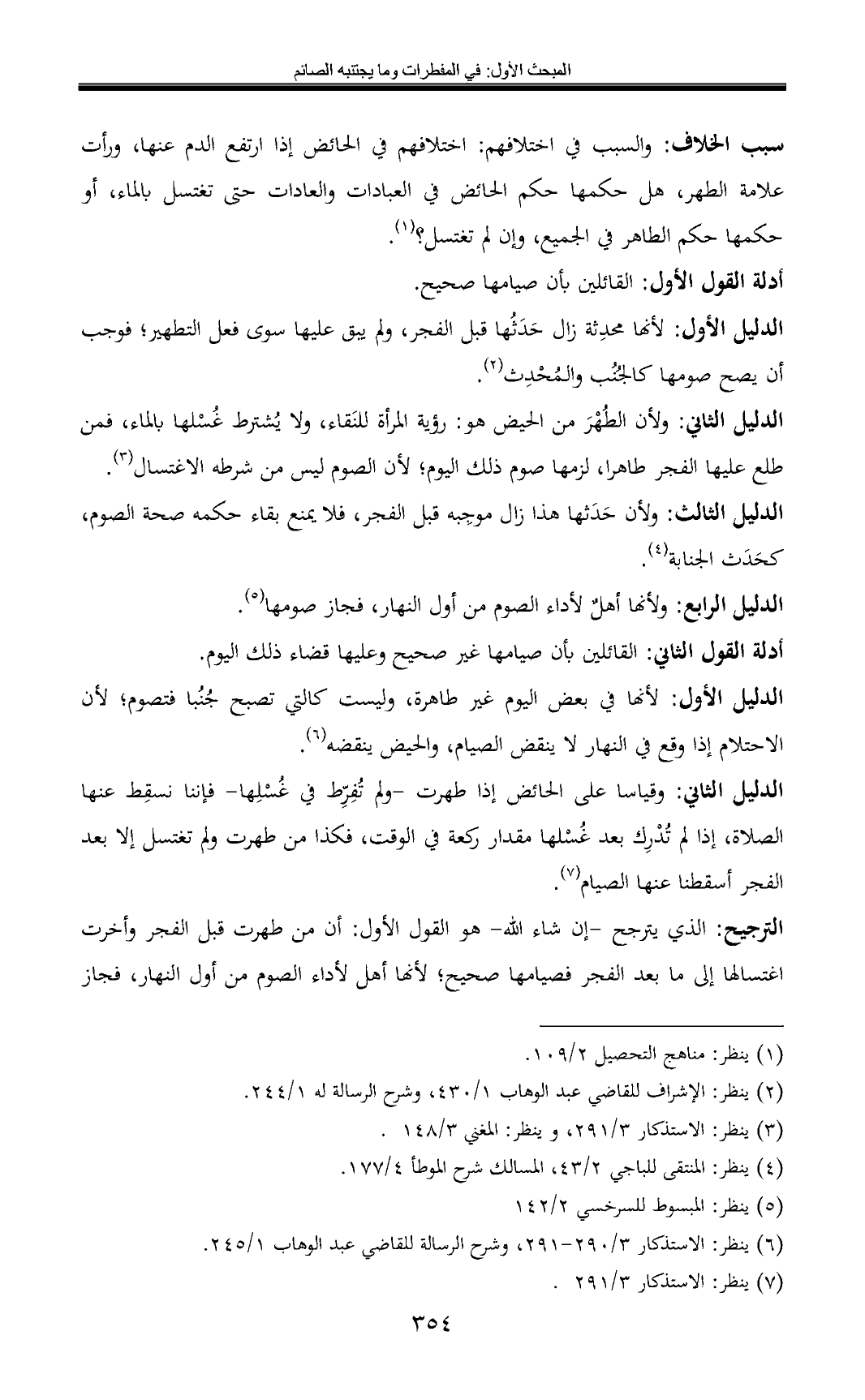 الدليل الأول: لأنها في بعض اليوم غير طاهرة، وليست كالتي تصبح جُنُبا فتصوم؛ لأن الاحتلام إذا وقع في النهار لا ينقض الصيام، والحيض ينقضه (¬6).