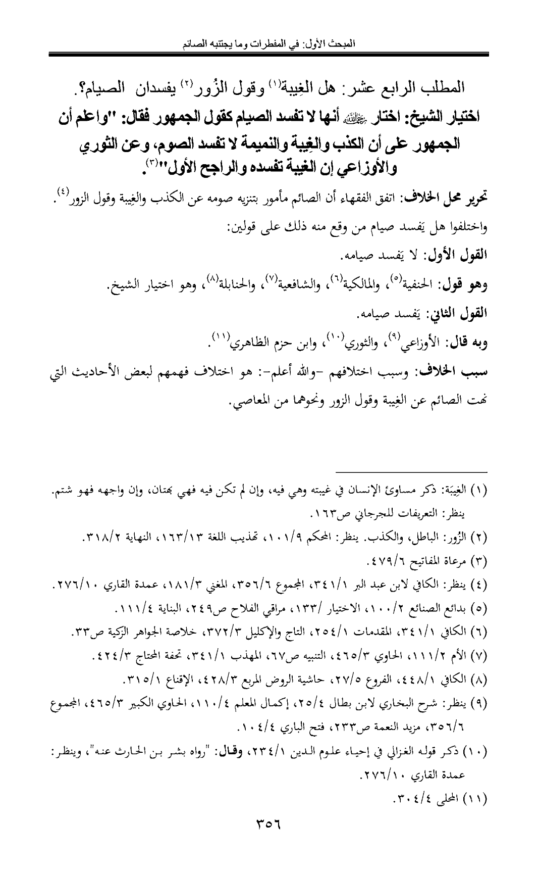اختيار الشيخ: اختار أنها لا تفسد الصيام كقول الجمهور فقال: "واعلم أن الجمهور على أن الكذب والغِيبة والنميمة لا تفسد الصوم، وعن الثوري والأوزاعي إن الغيبة تفسده والراجح الأول" (¬3).