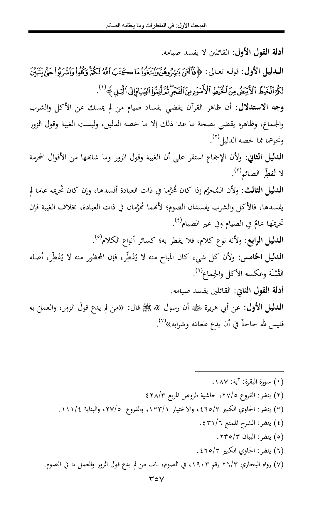 وجه الاستدلال: أن ظاهر القرآن يقضي بفساد صيام من لم يمسك عن الأكل والشرب والجماع، وظاهره يقضي بصحة ما عدا ذلك إلا ما خصه الدليل، وليست الغيبة وقول الزور ونحوهما مما خصه الدليل (¬2).