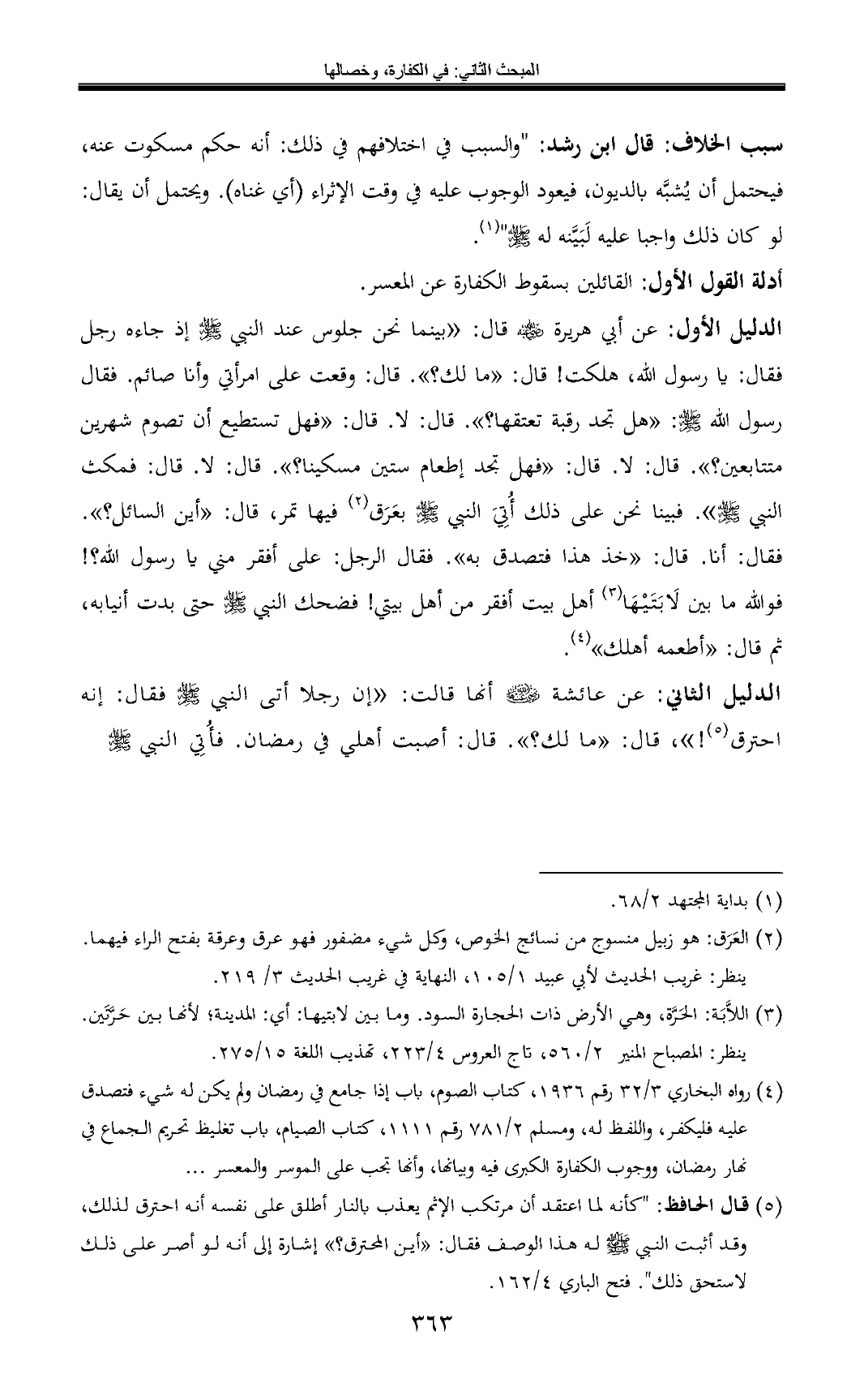 (¬4) رواه البخاري 3/ 32 رقم 1936, كتاب الصوم, باب إذا جامع في رمضان ولم يكن له شيء فتصدق عليه فليكفر, واللفظ له, ومسلم 2/ 781 رقم 1111, كتاب الصيام, باب تغليظ تحريم الجماع في نهار رمضان، ووجوب الكفارة الكبرى فيه وبيانها، وأنها تجب على الموسر والمعسر ...