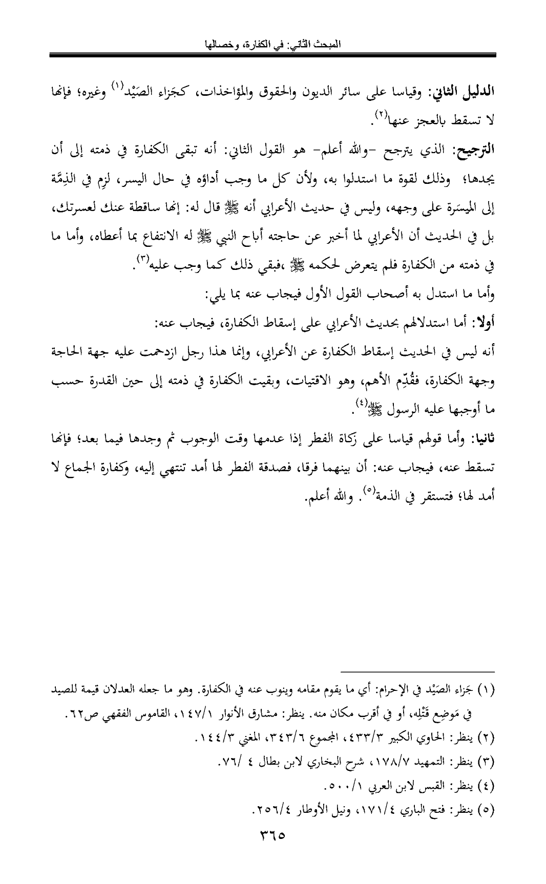 الترجيح: الذي يترجح -والله أعلم- هو القول الثاني: أنه تبقى الكفارة في ذمته إلى أن يجدها؛ وذلك لقوة ما استدلوا به، ولأن كل ما وجب أداؤه في حال اليسر، لزِم في الذِمَّة إلى المَيسَرة على وجهه، وليس في حديث الأعرابي أنه - صلى الله عليه وسلم - قال له: إنها ساقطة عنك لعسرتك، بل في الحديث أن الأعرابي لما أخبر عن حاجته أباح النبي - صلى الله عليه وسلم - له الانتفاع بما أعطاه، وأما ما في ذمته من الكفارة فلم يتعرض لحكمه - صلى الله عليه وسلم -، فبقي ذلك كما وجب عليه (¬3).