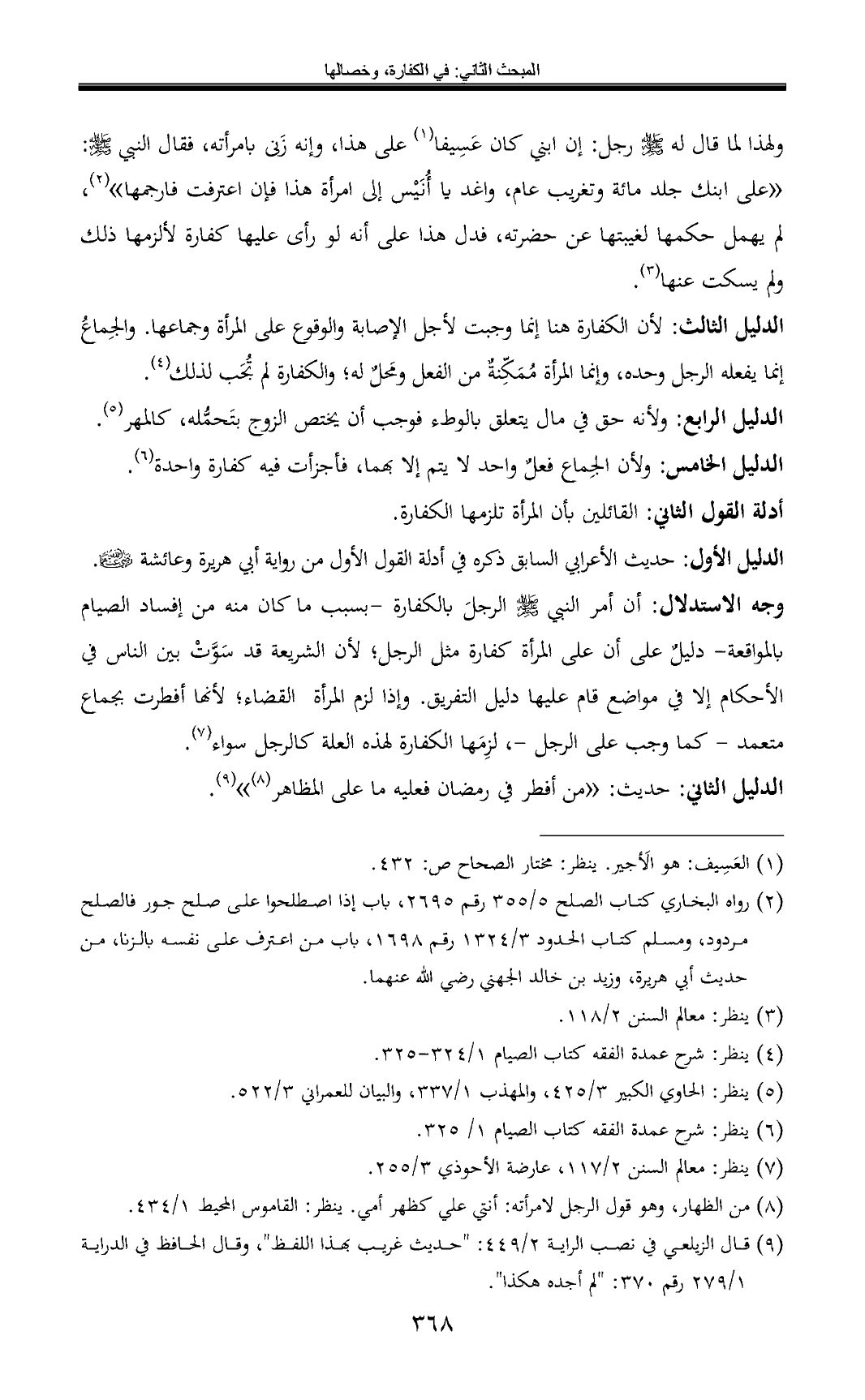 ولهذا لما قال له - صلى الله عليه وسلم - رجل: إن ابني كان عَسِيفا (¬1) على هذا، وإنه زَنى بامرأته، فقال النبي - صلى الله عليه وسلم -: «على ابنك جلد مائة وتغريب عام، واغد يا أُنَيْس إلى امرأة هذا فإن اعترفت فارجمها» (¬2)، لم يهمل حكمها لغيبتها عن حضرته, فدل هذا على أنه لو رأى عليها كفارة لألزمها ذلك ولم يسكت عنها (¬3).