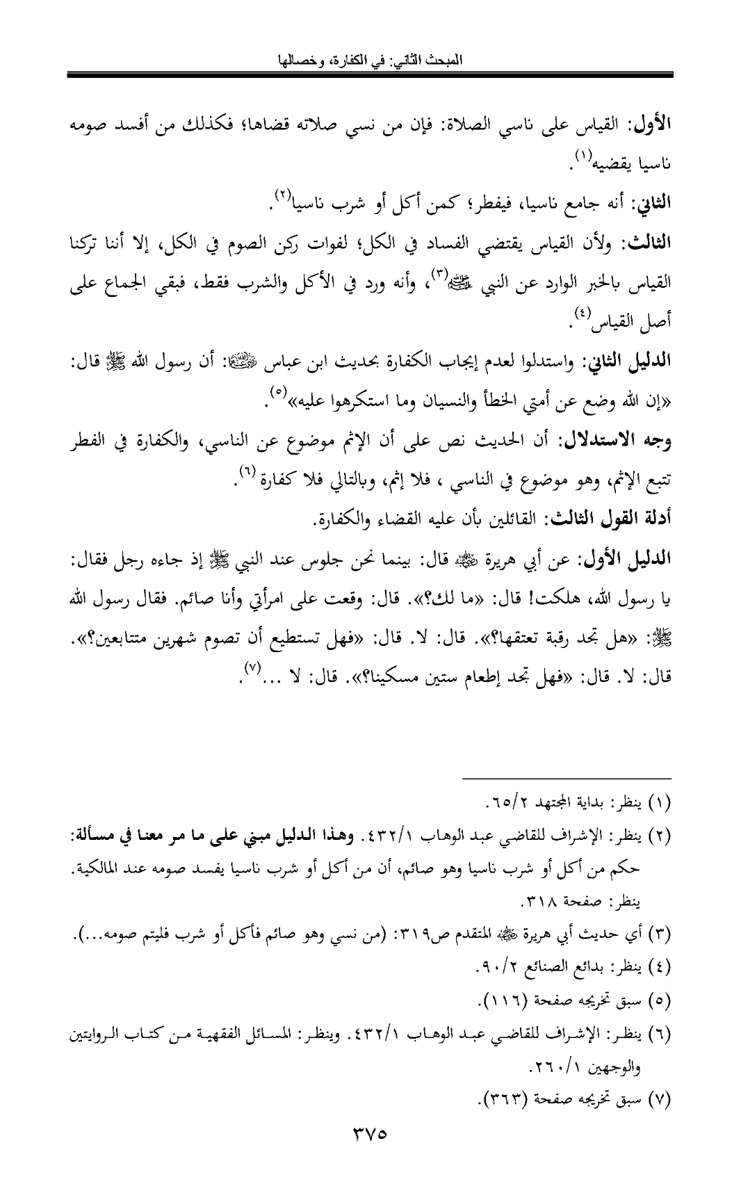(¬2) ينظر: الإشراف للقاضي عبد الوهاب 1/ 432. وهذا الدليل مبني على ما مر معنا في مسألة: حكم من أكل أو شرب ناسيا وهو صائم، أن من أكل أو شرب ناسيا يفسد صومه عند المالكية. ينظر: صفحة 318.