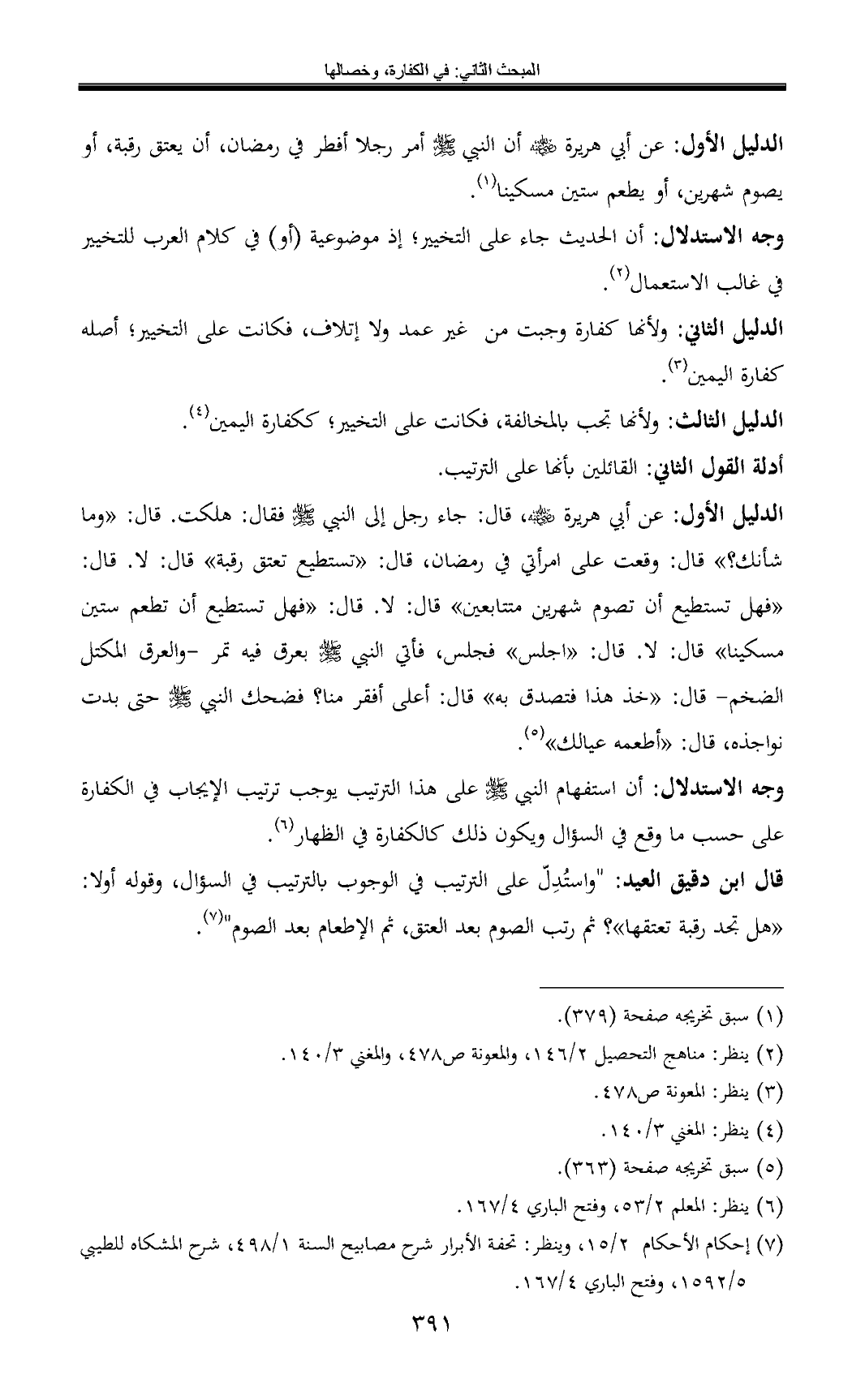 وجه الاستدلال: أن استفهام النبي - صلى الله عليه وسلم - على هذا الترتيب يوجب ترتيب الإيجاب في الكفارة على حسب ما وقع في السؤال ويكون ذلك كالكفارة في الظهار (¬6).