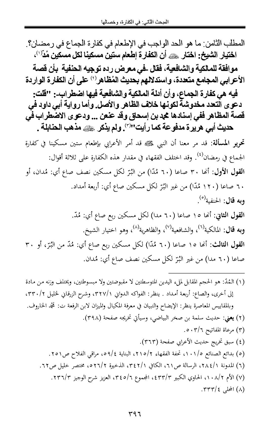 اختيار الشيخ: اختار أن الكفارة إطعام ستين مسكينا لكل مسكين مُدّ (¬1) , موافقة للمالكية والشافعية، فقال -في معرض رده توجيه الحنفية بأن قصة الأعرابي المجامع متعددة، واستدلالهم بحديث المُظاهر (¬2) على أن الكفارة الواردة فيه هي كفارة الجماع، وأن أدلة المالكية والشافعية فيها اضطراب-: "قلت: دعوى التعدد مخدوشة لكونها خلاف الظاهر والأصل. وأما رواية أبي داود في قصة المظاهر ففي إسنادها محمد بن إسحاق وقد عنعن ... ودعوى الاضطراب في حديث أبي هريرة مدفوعة كما رأيت" (¬3). ولم يذكر مذهب الحنابلة.