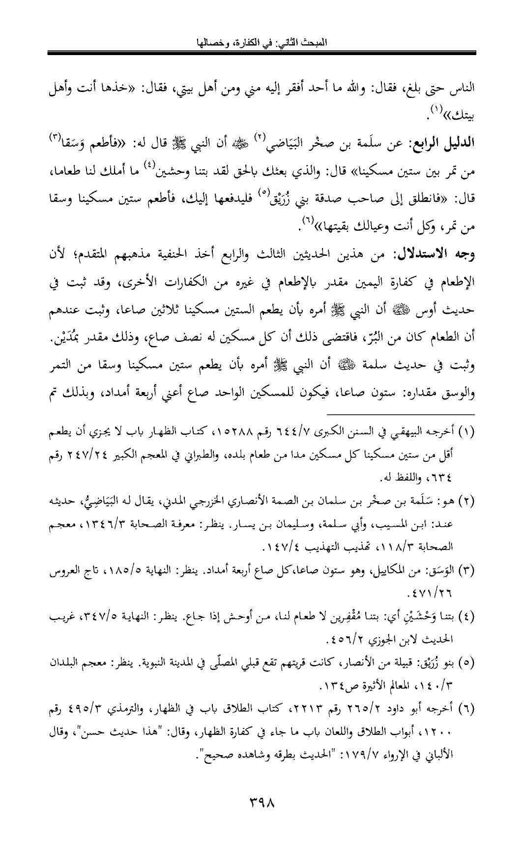 الدليل الرابع: عن سلَمة بن صخْر البَيَاضي (¬2) - رضي الله عنه - أن النبي - صلى الله عليه وسلم - قال له: «فأطعم وَسَقا (¬3) من تمر بين ستين مسكينا» قال: والذي بعثك بالحق لقد بتنا وحشين (¬4) ما أملك لنا طعاما، قال: «فانطلق إلى صاحب صدقة بني زُرَيْق (¬5) فليدفعها إليك، فأطعم ستين مسكينا وسقا من تمر، وكل أنت وعيالك بقيتها» (¬6).