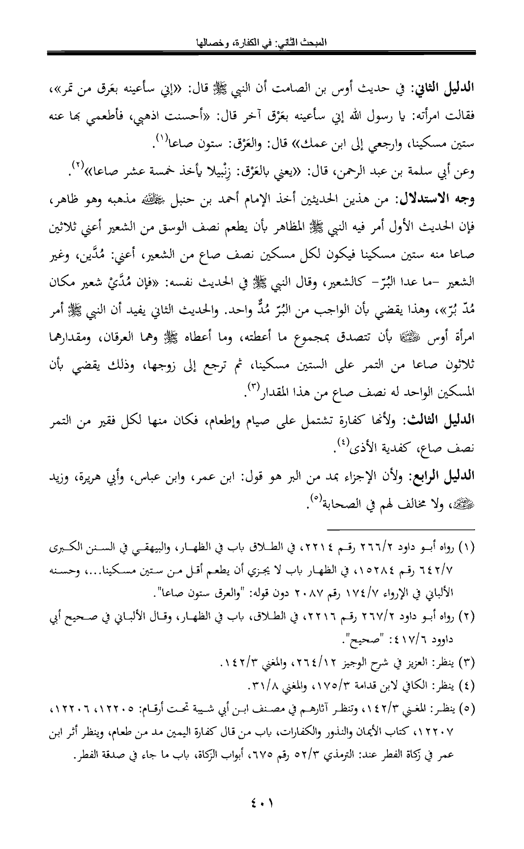 وجه الاستدلال: من هذين الحديثين أخذ الإمام أحمد بن حنبل مذهبه وهو ظاهر، فإن الحديث الأول أمر فيه النبي - صلى الله عليه وسلم - المظاهر بأن يطعم نصف الوسق من الشعير أعني ثلاثين صاعا منه ستين مسكينا فيكون لكل مسكين نصف صاع من الشعير، أعني: مُدَّين، وغير الشعير -ما عدا البُرّ- كالشعير، وقال النبي - صلى الله عليه وسلم - في الحديث نفسه: «فإن مُدَّيْ شعير مكان مُدّ بُرّ»، وهذا يقضي بأن الواجب من البُرّ مُدٌّ واحد. والحديث الثاني يفيد أن النبي - صلى الله عليه وسلم - أمر امرأة أوس - رضي الله عنهما - بأن تتصدق بمجموع ما أعطته، وما أعطاه - صلى الله عليه وسلم - وهما العرقان، ومقدارهما ثلاثون صاعا من التمر على الستين مسكينا، ثم ترجع إلى زوجها، وذلك يقضي بأن المسكين الواحد له نصف صاع من هذا المقدار (¬3).