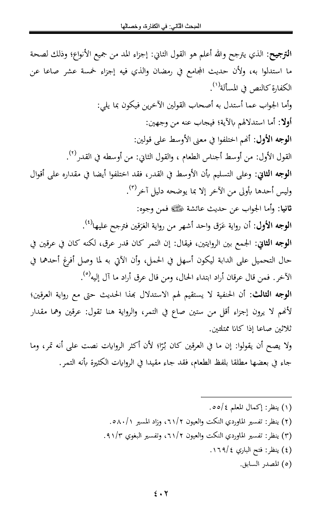 الترجيح: الذي يترجح والله أعلم هو القول الثاني: إجزاء المد من جميع الأنواع؛ وذلك لصحة ما استدلوا به, ولأن حديث المجامع في رمضان والذي فيه إجزاء خمسة عشر صاعا عن الكفارة كالنص في المسألة (¬1).
