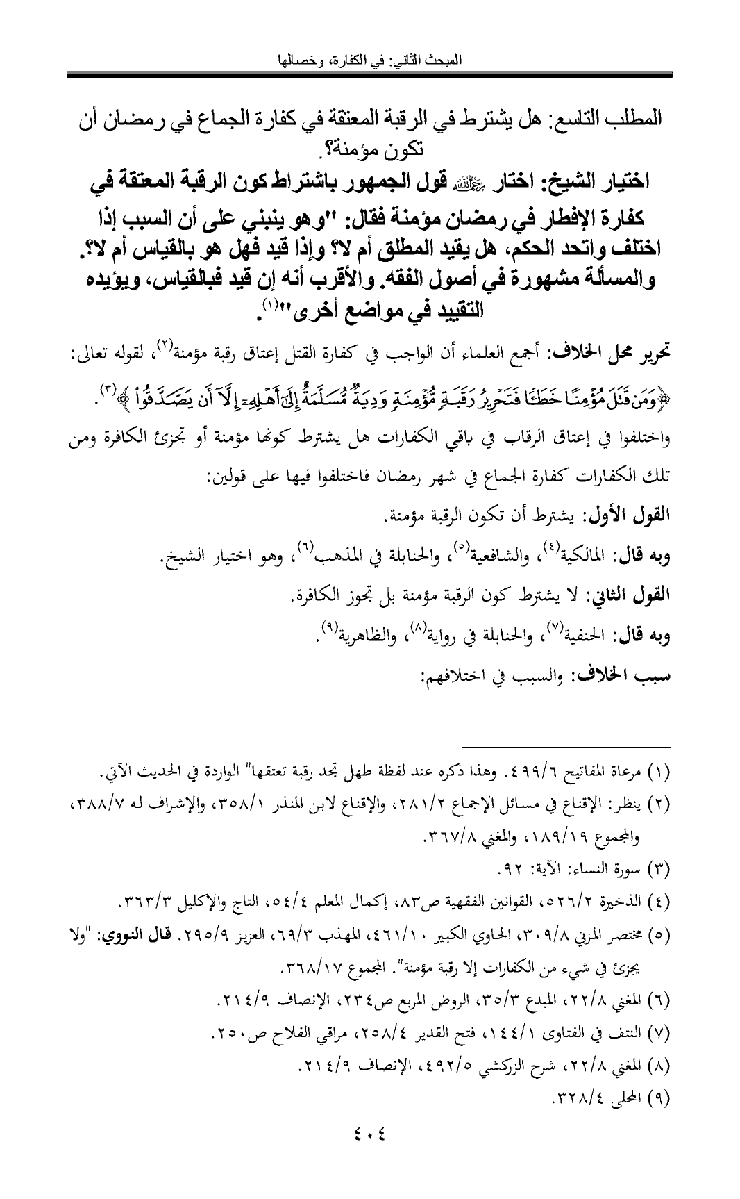 المطلب التاسع: هل يشترط في الرقبة المعتقة في كفارة الجماع في رمضان أن تكون مؤمنة؟ .