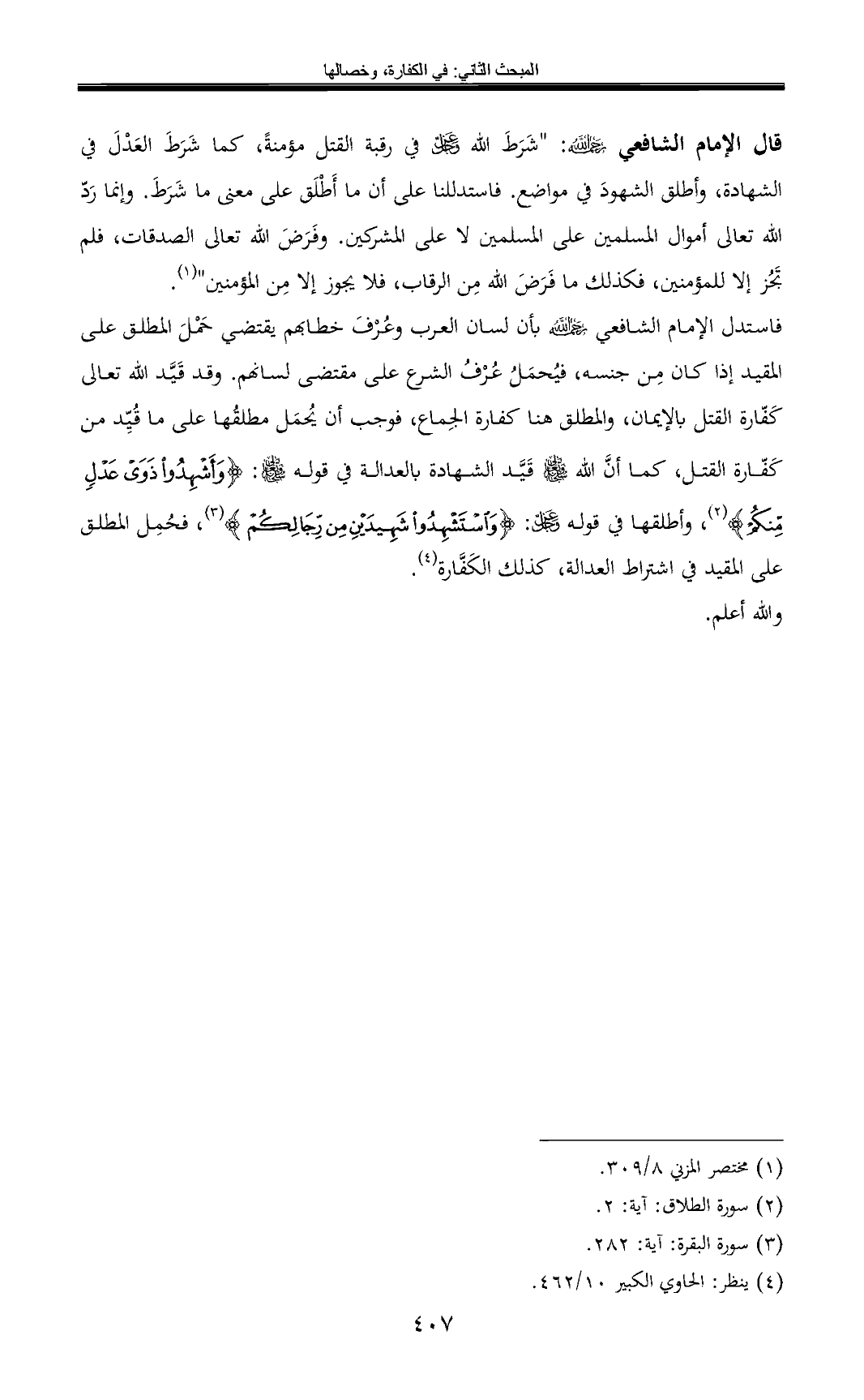قال الإمام الشافعي: "شَرَطَ الله عز وجل في رقبة القتل مؤمنةً، كما شَرَطَ العَدْلَ في الشهادة، وأطلق الشهودَ في مواضع. فاستدللنا على أن ما أَطْلَق على معنى ما شَرَطَ. وإنما رَدّ الله تعالى أموال المسلمين على المسلمين لا على المشركين. وفَرَضَ الله تعالى الصدقات، فلم تَجُز إلا للمؤمنين، فكذلك ما فَرَضَ الله مِن الرقاب، فلا يجوز إلا مِن المؤمنين" (¬1).