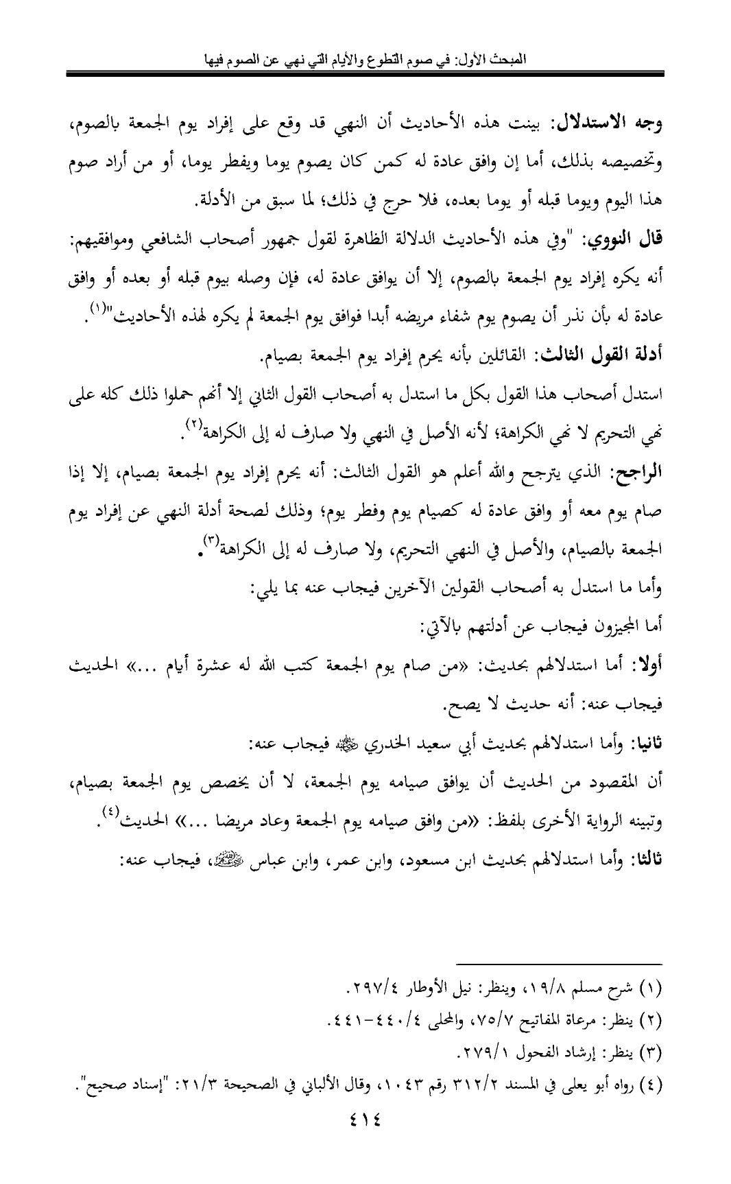 الراجح: الذي يترجح والله أعلم هو القول الثالث: أنه يحرم إفراد يوم الجمعة بصيام، إلا إذا صام يوم معه أو وافق عادة له كصيام يوم وفطر يوم؛ وذلك لصحة أدلة النهي عن إفراد يوم الجمعة بالصيام، والأصل في النهي التحريم، ولا صارف له إلى الكراهة (¬3).