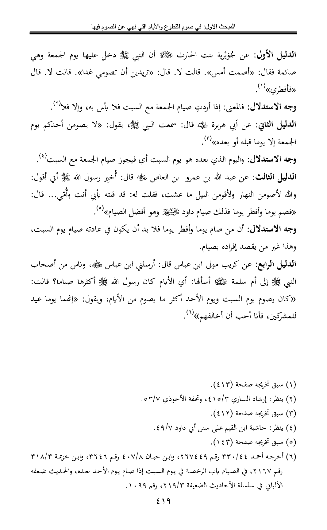 (¬6) أخرجه أحمد 44/ 330 رقم 267449, وابن حبان 8/ 407 رقم 3646, وابن خزيمة 3/ 318 رقم 2167, في الصيام باب الرخصة في يوم السبت إذا صام يوم الأحد بعده, والحديث ضعفه الألباني في سلسلة الأحاديث الضعيفة 3/ 219, رقم 1099.