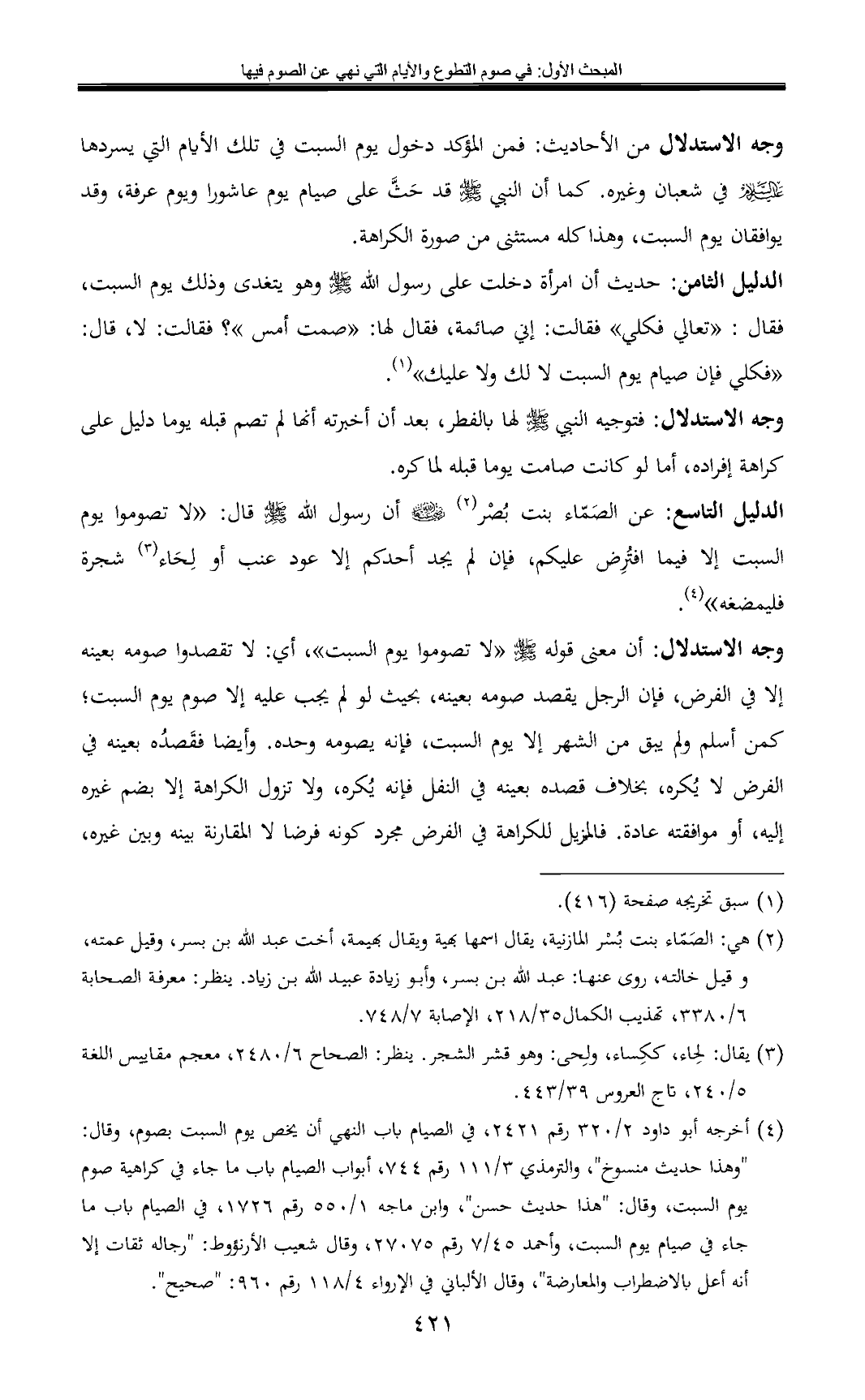 الدليل التاسع: عن الصَمّاء بنت بُصْر (¬2) - رضي الله عنها - أن رسول الله - صلى الله عليه وسلم - قال: «لا تصوموا يوم السبت إلا فيما افتُرِض عليكم, فإن لم يجد أحدكم إلا عود عنب أو لِحَاء (¬3) شجرة فليمضغه» (¬4).