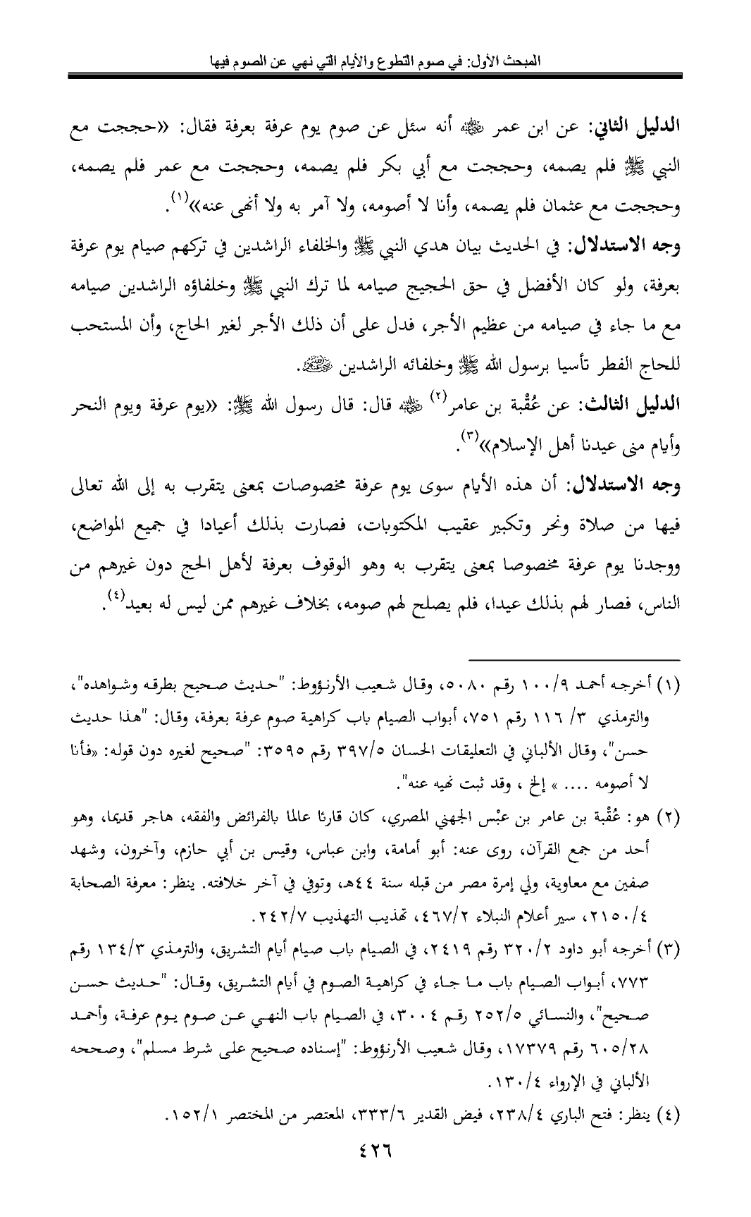 الدليل الثالث: عن عُقْبة بن عامر (¬2) - رضي الله عنه - قال: قال رسول الله - صلى الله عليه وسلم -: «يوم عرفة ويوم النحر وأيام منى عيدنا أهل الإسلام» (¬3).