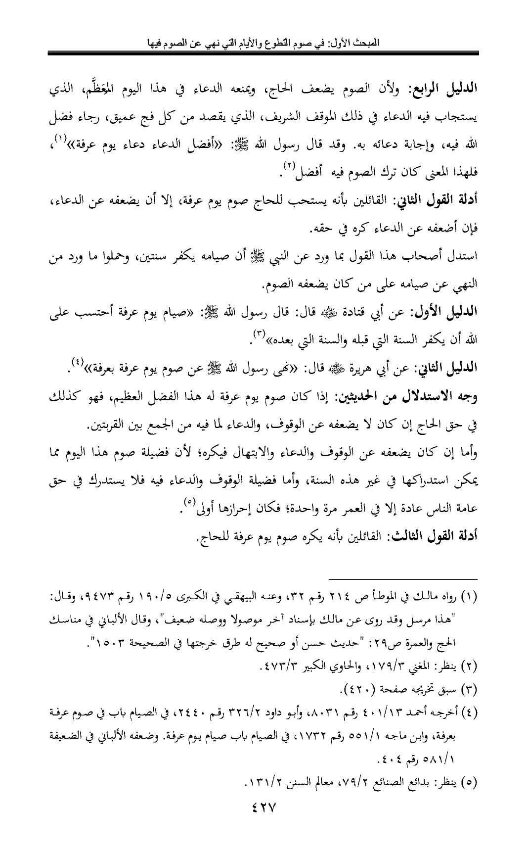 الدليل الرابع: ولأن الصوم يضعف الحاج، ويمنعه الدعاء في هذا اليوم المُعَظَّم، الذي يستجاب فيه الدعاء في ذلك الموقف الشريف، الذي يقصد من كل فج عميق، رجاء فضل الله فيه، وإجابة دعائه به. وقد قال رسول الله - صلى الله عليه وسلم -: «أفضل الدعاء دعاء يوم عرفة» (¬1)، فلهذا المعنى كان ترك الصوم فيه أفضل (¬2).