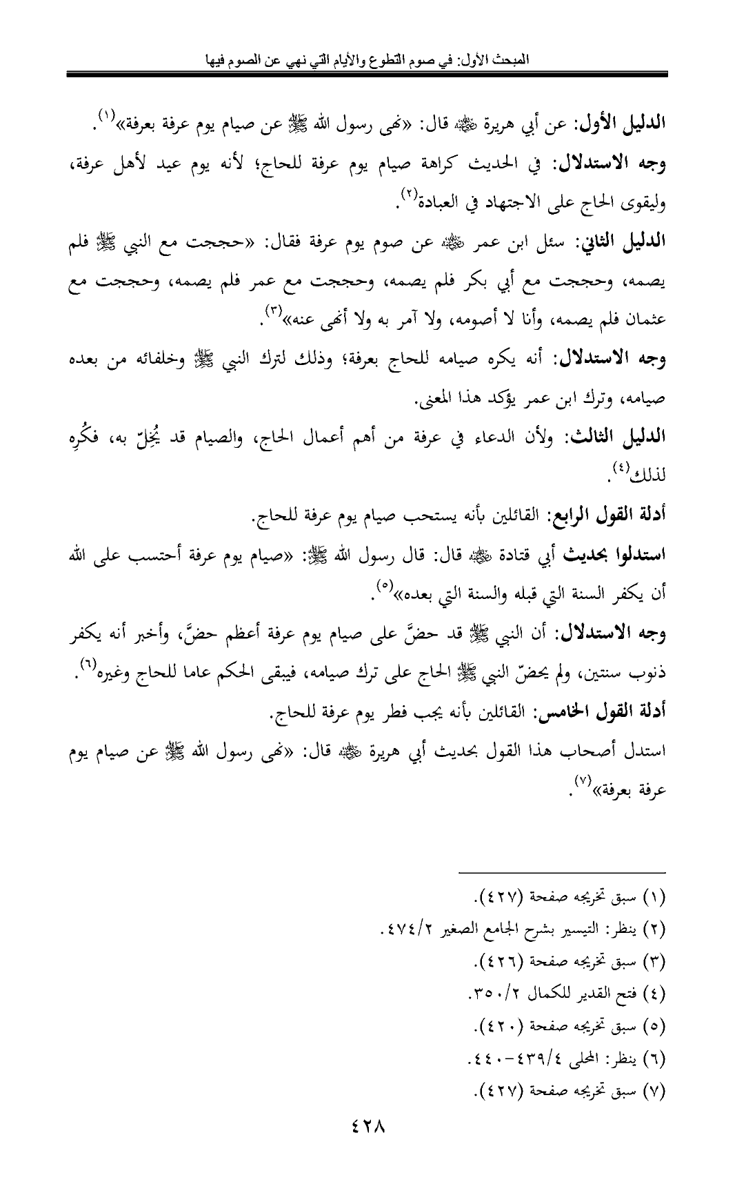الدليل الأول: عن أبي هريرة - رضي الله عنه - قال: «نهى رسول الله - صلى الله عليه وسلم - عن صيام يوم عرفة بعرفة» (¬1).