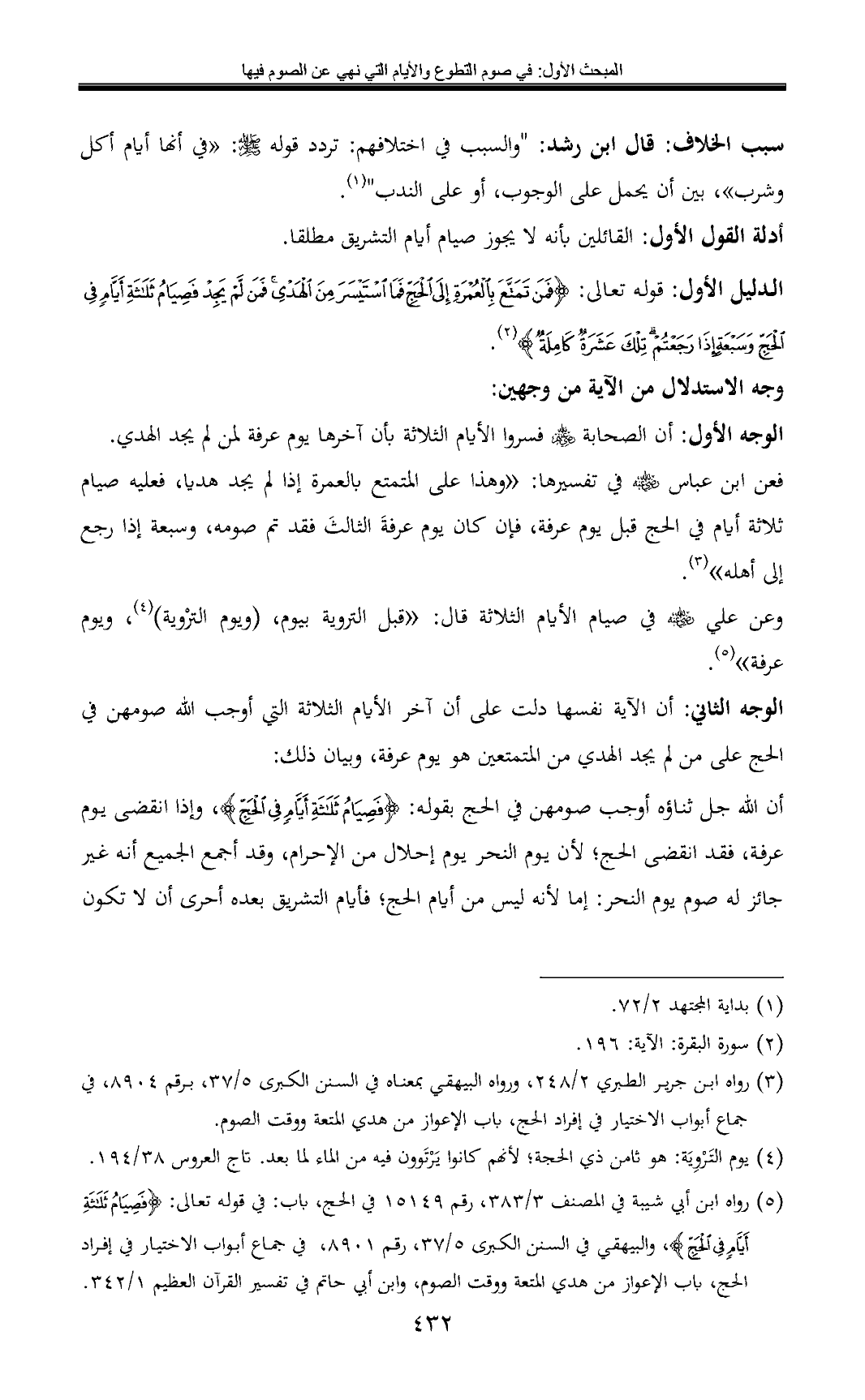 (¬5) رواه ابن أبي شيبة في المصنف 3/ 383، رقم 15149 في الحج، باب: في قوله تعالى: {فَصِيَامُ ثَلَاثَةِ أَيَّامٍ فِي الْحَجِّ}، والبيهقي في السنن الكبرى 5/ 37، رقم 8901، في جماع أبواب الاختيار في إفراد الحج، باب الإعواز من هدي المتعة ووقت الصوم، وابن أبي حاتم في تفسير القرآن العظيم 1/ 342.