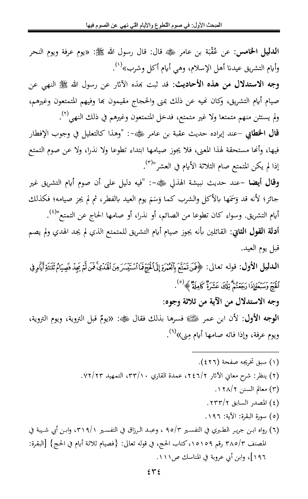 وجه الاستدلال من هذه الأحاديث: قد ثبت بهذه الآثار عن رسول الله - صلى الله عليه وسلم - النهي عن صيام أيام التشريق، وكان نهيه عن ذلك بمنى والحجاج مقيمون بها وفيهم المتمتعون وغيرهم، ولم يستثن منهم متمتعا ولا غير متمتع، فدخل المتمتعون وغيرهم في ذلك النهي (¬2).