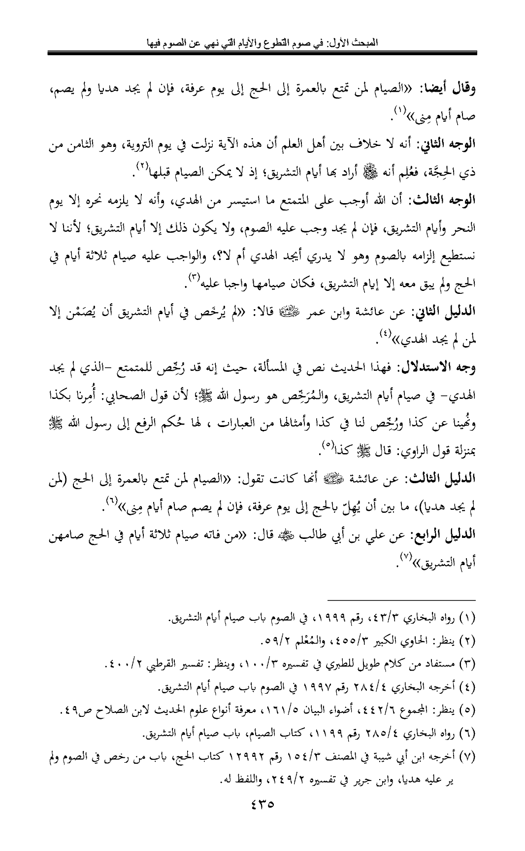 الدليل الرابع: عن علي بن أبي طالب - رضي الله عنه - قال: «من فاته صيام ثلاثة أيام في الحج صامهن أيام التشريق» (¬7).