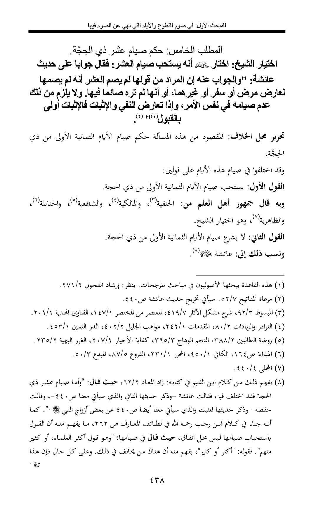 (¬8) يفهم ذلك من كلام ابن القيم في كتابه: زاد المعاد 2/ 62، حيث قال: "وأما صيام عشر ذي الحجة فقد اختلف فيه، فقالت عائشة -وذكر حديثها النافي والذي سيأتي معنا ص 440 - ، وقالت حفصة -وذكر حديثها المثبت والذي سيأتي معنا أيضا ص 440 عن بعض أزواج النبي - صلى الله عليه وسلم - ". كما أنه جاء في كلام ابن رجب رحمه الله في لطائف المعارف ص 262, ما يفهم منه أن القول باستحباب صيامها ليس محل اتفاق، حيث قال في صيامها: "وهو قول أكثر العلماء، أو كثير منهم". فقوله: "أكثر أو كثير"، يفهم منه أن هناك من يخالف في ذلك. وعلى كل حال فإن هذا القول لم ينسب إلى أحد بعينه، إلا ما فهم من كلام ابن القيم, والصحيح أن مراده الخلاف في نقل صيامه - صلى الله عليه وسلم - لا في مشروعية الصيام، لأنه قال بعد ذلك 2/ 63: "والمثبت مقدم على النافي إن صح"، فدل على أن مراده الاختلاف في النقل لا في المشروعية. وقد ظهر في هذا الزمان من ألف كتابا سماه: (من أخطائنا في العشر)، وعد من ضمن الأخطاء صيام العامة لعشر ذي الحجة، وبالغ في ذلك حتى اعتبر صيامها من البدع, وقد انتشر هذا الكلام ولقي رواجا كبيرا بين طلبة العلم، خاصة على وسائل التواصل الاجتماعي.