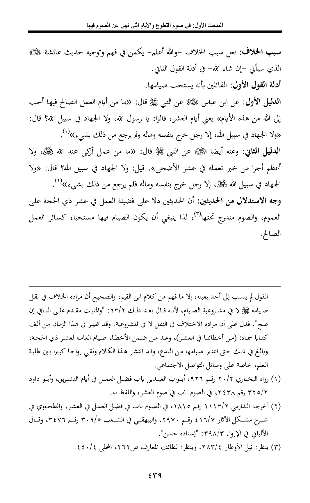 وجه الاستدلال من الحديثين: أن الحديثين دلا على فضيلة العمل في عشر ذي الحجة على العموم، والصوم مندرج تحتها (¬3)، لذا ينبغي أن يكون الصيام فيها مستحبا، كسائر العمل الصالح.