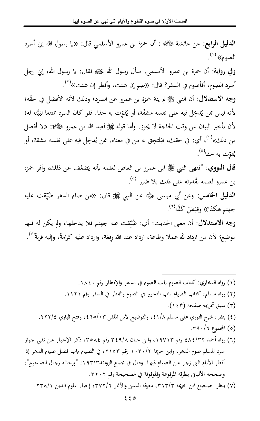 وجه الاستدلال: أن النبي - صلى الله عليه وسلم - لم ينهَ حمزة بن عمرو عن السرد؛ وذلك لأنه الأفضل في حقّه؛ لأنه ليس ممن يُدخِل فيه على نفسه مشقّة، أو يُفوِّت به حقا. فلو كان السرد ممتنعا لبَيَّنه له؛ لأن تأخير البيان عن وقت الحاجة لا يجوز. وأما قوله - صلى الله عليه وسلم - لعبد الله بن عمرو - رضي الله عنهما -: «لا أفضل من ذلك» (¬3) , أي: في حقك, فيَلتحِق به من في معناه، ممن يُدخِل فيه على نفسه مشقة، أو يُفوِّت به حقا (¬4).