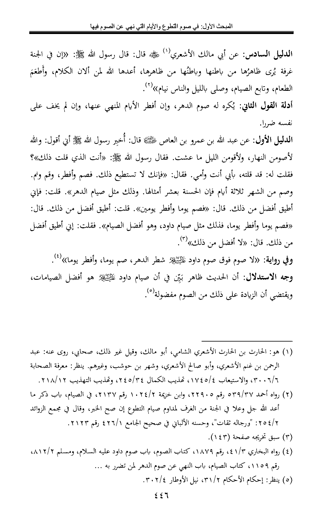 الدليل الأول: عن عبد الله بن عمرو بن العاص - رضي الله عنهما - قال: أُخبِر رسول الله - صلى الله عليه وسلم - أني أقول: والله لأصومن النهار، ولأقومن الليل ما عشت. فقال رسول الله - صلى الله عليه وسلم -: «أنت الذي قلت ذلك»؟ فقلت له: قد قلته، بأبي أنت وأمي. فقال: «فإنك لا تستطيع ذلك. فصم وأفطر، وقم ونم. وصم من الشهر ثلاثة أيام فإن الحسنة بعشر أمثالها. وذلك مثل صيام الدهر». قلت: فإني أطيق أفضل من ذلك. قال: «فصم يوما وأفطر يومين». قلت: أطيق أفضل من ذلك. قال: «فصم يوما وأفطر يوما, فذلك مثل صيام داود, وهو أفضل الصيام». فقلت: إني أطيق أفضل من ذلك. قال: «لا أفضل من ذلك» (¬3).