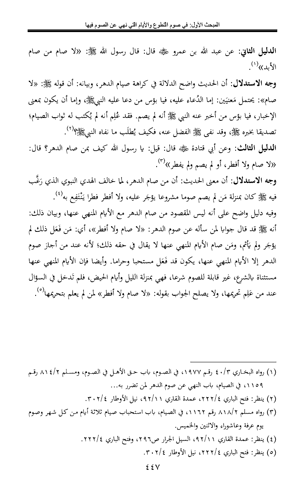 الدليل الثاني: عن عبد الله بن عمرو - رضي الله عنه - قال: قال رسول الله - صلى الله عليه وسلم -: «لا صام من صام الأبد» (¬1).