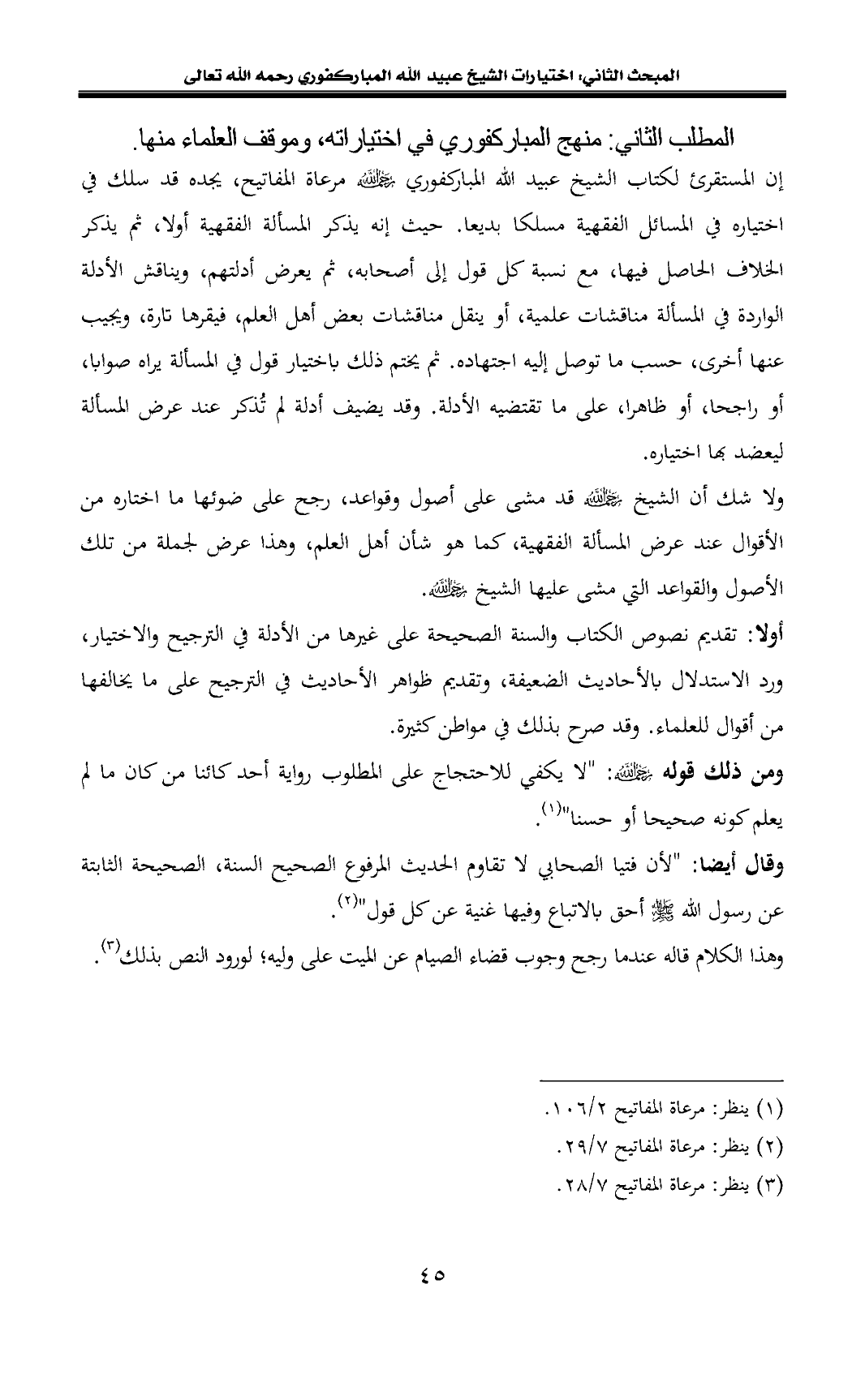 المطلب الثاني: منهج المباركفوري في اختياراته، وموقف العلماء منها.