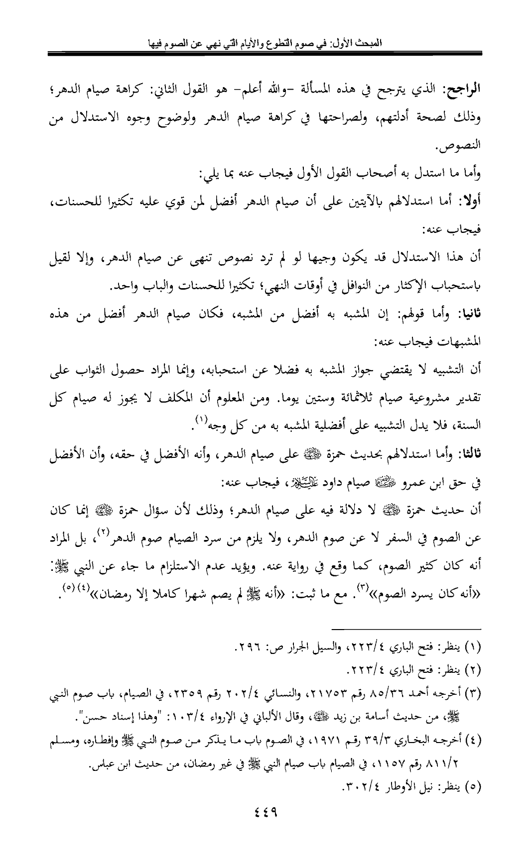 ثالثا: وأما استدلالهم بحديث حمزة ¢ على صيام الدهر, وأنه الأفضل في حقه, وأن الأفضل في حق ابن عمرو - رضي الله عنهما - صيام داود - عليه السلام -, فيجاب عنه: