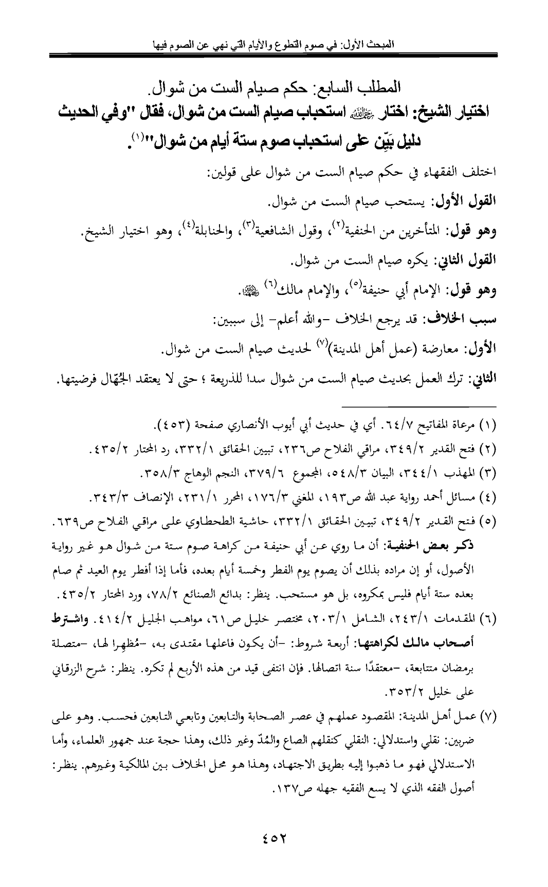 (¬5) فتح القدير 2/ 349, تبيين الحقائق 1/ 332, حاشية الطحطاوي على مراقي الفلاح ص 639. ذكر بعض الحنفية: أن ما روي عن أبي حنيفة من كراهة صوم ستة من شوال هو غير رواية الأصول, أو إن مراده بذلك أن يصوم يوم الفطر وخمسة أيام بعده، فأما إذا أفطر يوم العيد ثم صام بعده ستة أيام فليس بمكروه, بل هو مستحب. ينظر: بدائع الصنائع 2/ 78, ورد المحتار 2/ 435.