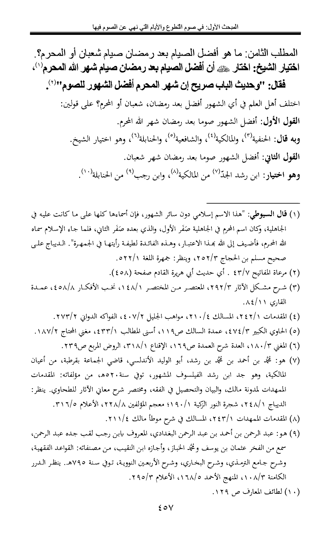 اختيار الشيخ: اختار أن أفضل الصيام بعد رمضان صيام شهر الله المحرم (¬1)، فقال: "وحديث الباب صريح إن شهر المحرم أفضل الشهور للصوم" (¬2).