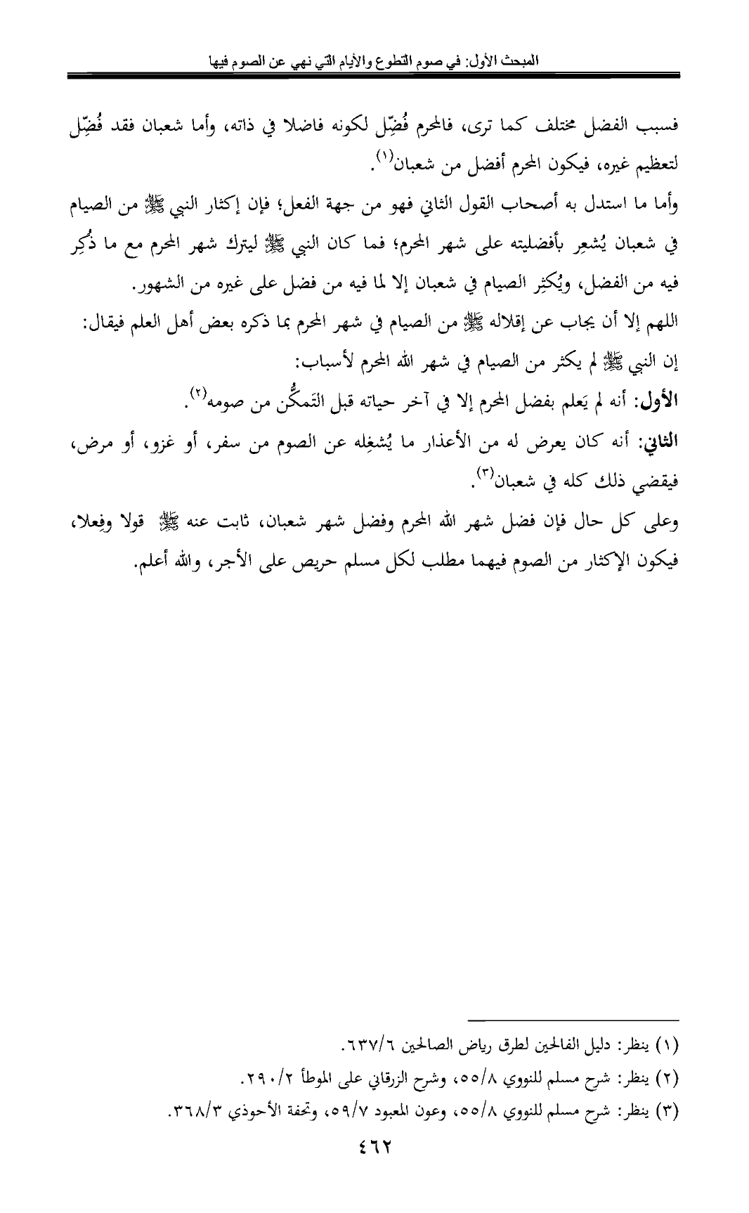 فسبب الفضل مختلف كما ترى، فالمحرم فُضِّل لكونه فاضلا في ذاته، وأما شعبان فقد فُضِّل لتعظيم غيره، فيكون المحرم أفضل من شعبان (¬1).