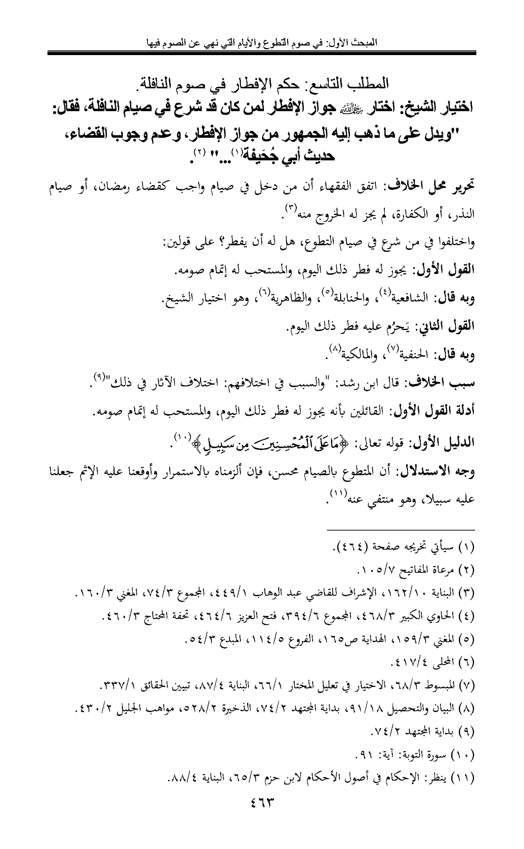 اختيار الشيخ: اختار جواز الإفطار لمن كان قد شرع في صيام النافلة، فقال: "ويدل على ما ذهب إليه الجمهور من جواز الإفطار، وعدم وجوب القضاء، حديث أبي جُحَيفة (¬1) ... " (¬2).