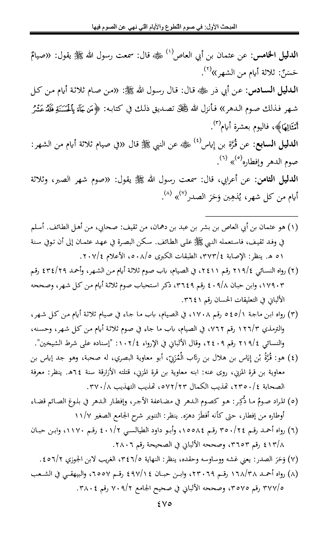 الدليل السابع: عن قُرَّة بن إِياس (¬4) - رضي الله عنه - عن النبي - صلى الله عليه وسلم - قال «في صيام ثلاثة أيام من الشهر: صوم الدهر وإفطاره (¬5)» (¬6).