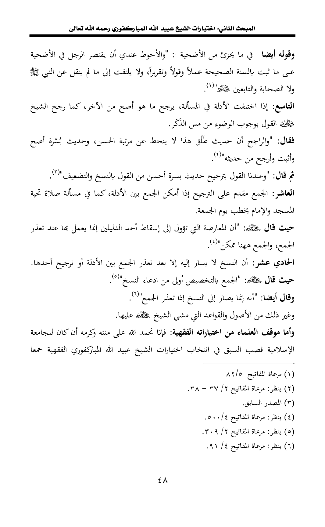 وأما موقف العلماء من اختياراته الفقهية: فإنا نحمد الله على منته وكرمه أن كان للجامعة الإسلامية قصب السبق في انتخاب اختيارات الشيخ عبيد الله المباركفوري الفقهية جمعا