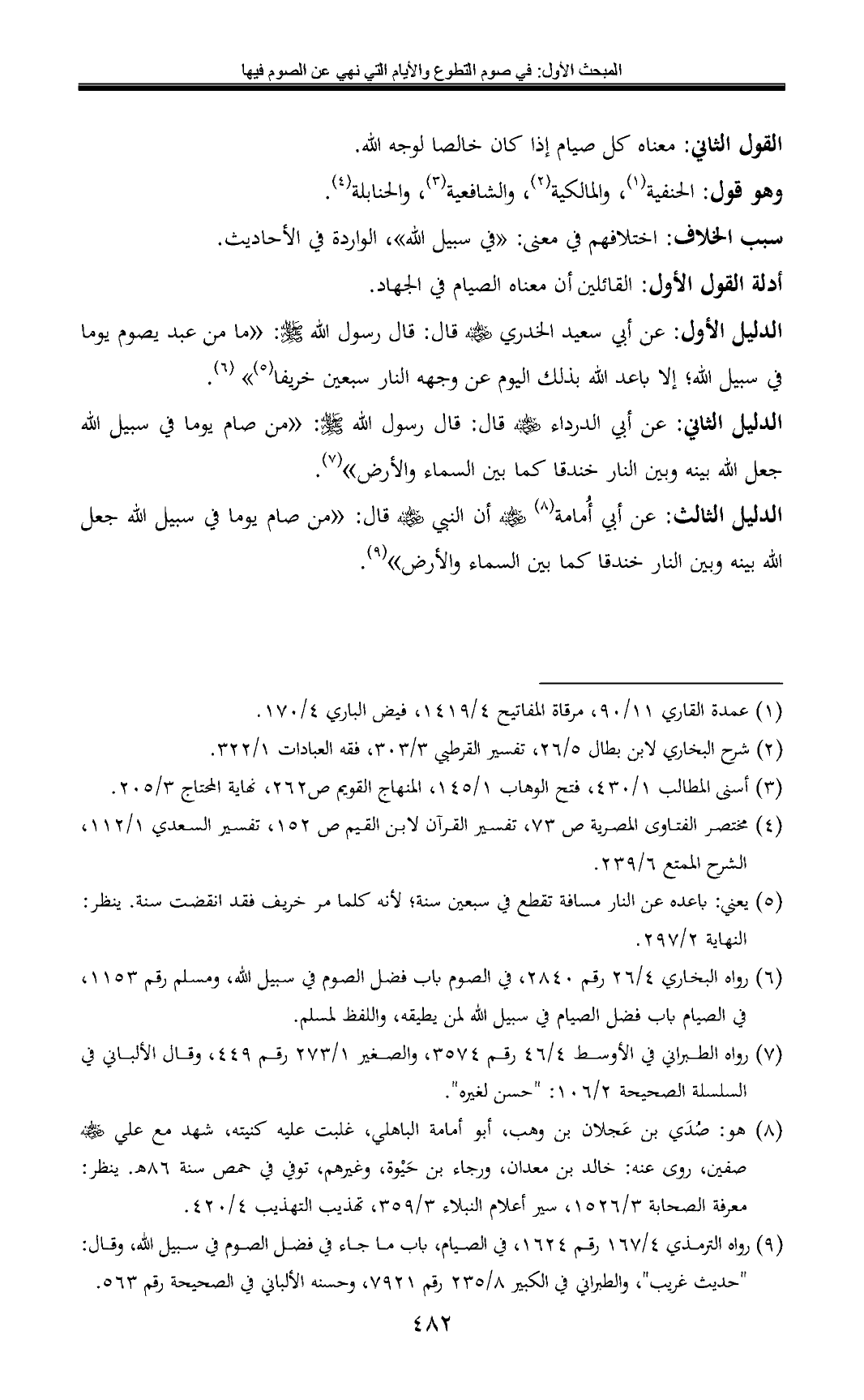 الدليل الثالث: عن أبي أُمامة (¬8) - رضي الله عنه - أن النبي - رضي الله عنه - قال: «من صام يوما في سبيل الله جعل الله بينه وبين النار خندقا كما بين السماء والأرض» (¬9).