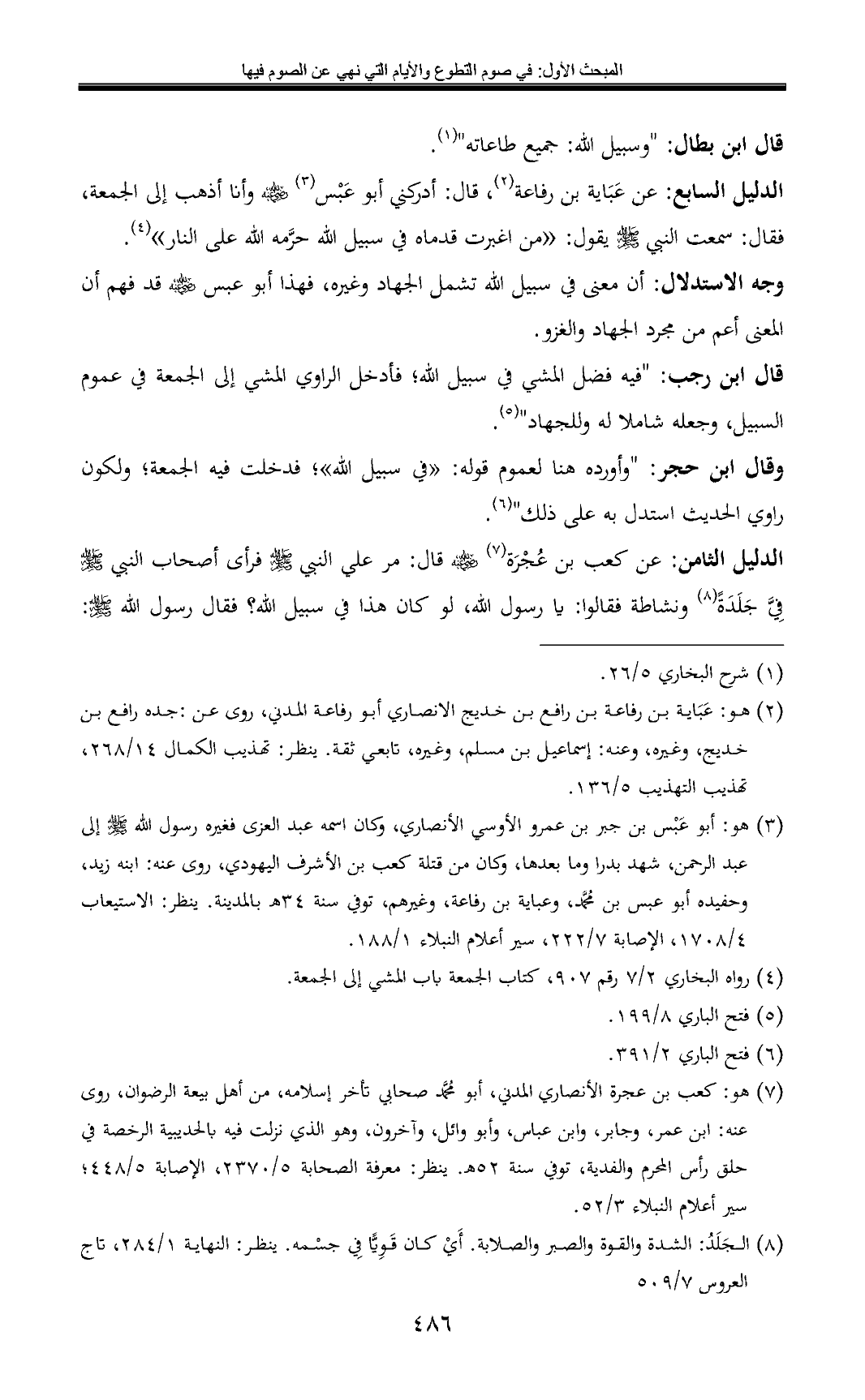 الدليل السابع: عن عَبَاية بن رفاعة (¬2)، قال: أدركني أبو عَبْس (¬3) - رضي الله عنه - وأنا أذهب إلى الجمعة، فقال: سمعت النبي - صلى الله عليه وسلم - يقول: «من اغبرت قدماه في سبيل الله حرَّمه الله على النار» (¬4).