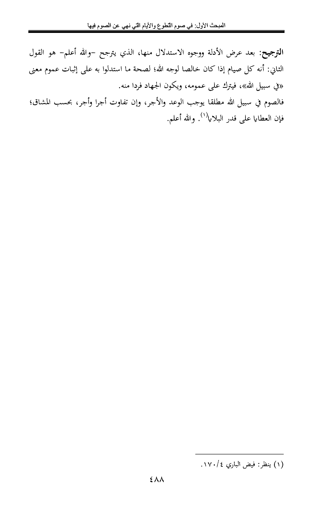 الترجيح: بعد عرض الأدلة ووجوه الاستدلال منها, الذي يترجح -والله أعلم- هو القول الثاني: أنه كل صيام إذا كان خالصا لوجه الله؛ لصحة ما استدلوا به على إثبات عموم معنى «في سبيل الله»، فيترك على عمومه، ويكون الجهاد فردا منه.