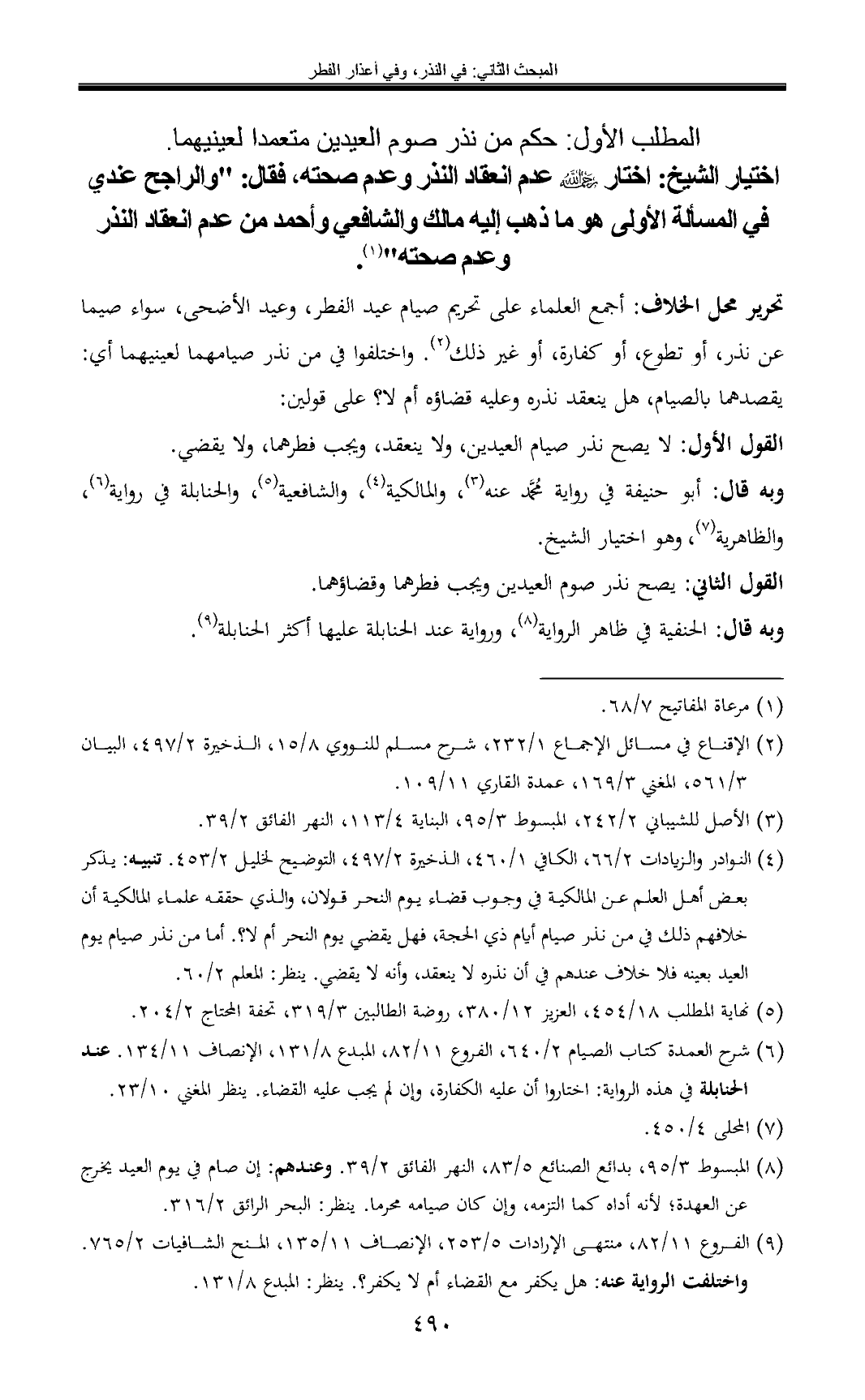 تحرير محل الخلاف: أجمع العلماء على تحريم صيام عيد الفطر، وعيد الأضحى، سواء صيما عن نذر، أو تطوع، أو كفارة، أو غير ذلك (¬2). واختلفوا في من نذر صيامهما لعينيهما أي: يقصدهما بالصيام، هل ينعقد نذره وعليه قضاؤه أم لا؟ على قولين: