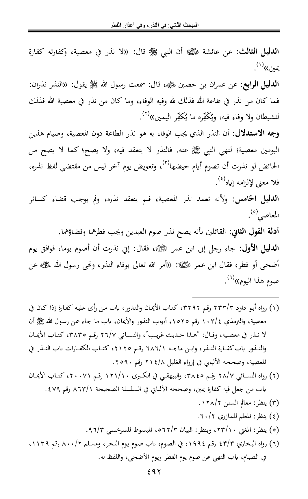 (¬1) رواه أبو داود 3/ 233 رقم 3292, كتاب الأيمان والنذور, باب من رأى عليه كفارة إذا كان في معصية, والترمذي 4/ 103 رقم 1525, أبواب النذور والأيمان, باب ما جاء عن رسول الله - صلى الله عليه وسلم - أن لا نذر في معصية, وقال: "هذا حديث غريب", والنسائي 7/ 26 رقم 3835, كتاب الأيمان والنذور باب كفارة النذر, وابن ماجه 1/ 686 رقم 2125, كتاب الكفارات باب النذر في المعصية, وصححه الألباني في إرواء الغليل 8/ 214 رقم 2590.