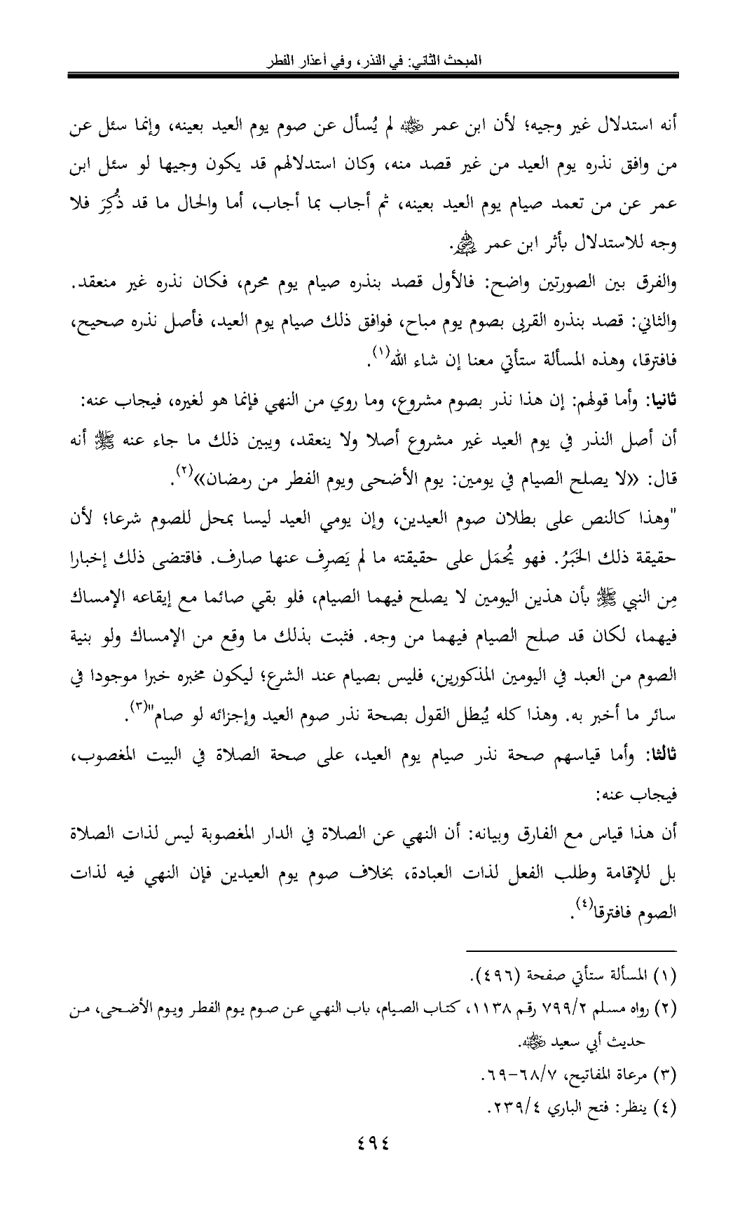 أنه استدلال غير وجيه؛ لأن ابن عمر - رضي الله عنه - لم يُسأل عن صوم يوم العيد بعينه, وإنما سئل عن من وافق نذره يوم العيد من غير قصد منه، وكان استدلالهم قد يكون وجيها لو سئل ابن عمر عن من تعمد صيام يوم العيد بعينه, ثم أجاب بما أجاب، أما والحال ما قد ذُكِرَ فلا وجه للاستدلال بأثر ابن عمر رضي الله عنهم.