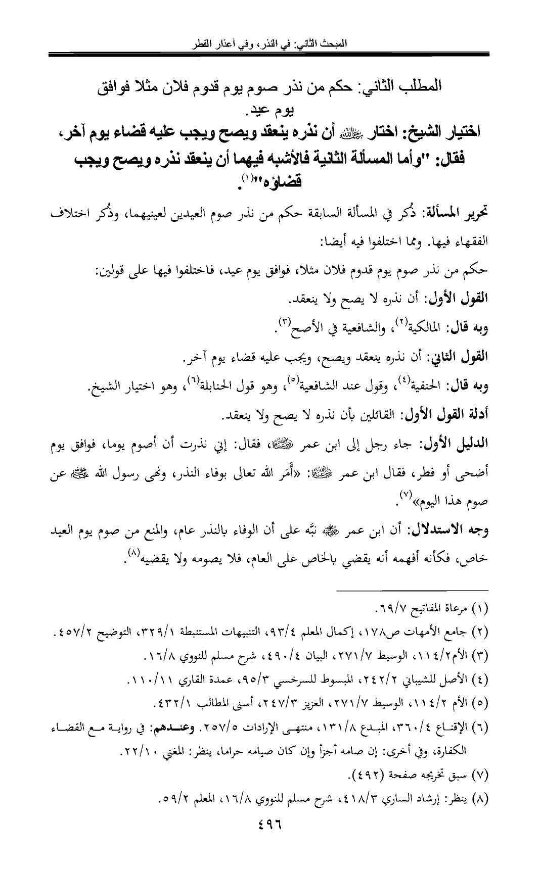 اختيار الشيخ: اختار أن نذره ينعقد ويصح ويجب عليه قضاء يوم آخر، فقال: "وأما المسألة الثانية فالأشبه فيهما أن ينعقد نذره ويصح ويجب قضاؤه" (¬1).