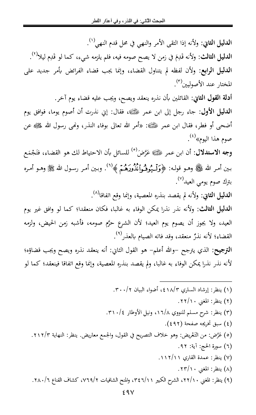 وجه الاستدلال: أن ابن عمر - رضي الله عنهما - عَرَّضَ (¬5) للسائل بأن الاحتياط لك هو القضاء، فتَجْمَع بين أمر الله سبحانه وتعالى وهو قوله: {وَلْيُوفُوا نُذُورَهُمْ} (¬6). وبين أمر رسول الله - صلى الله عليه وسلم - وهو أمره بترك صوم يومي العيد (¬7).