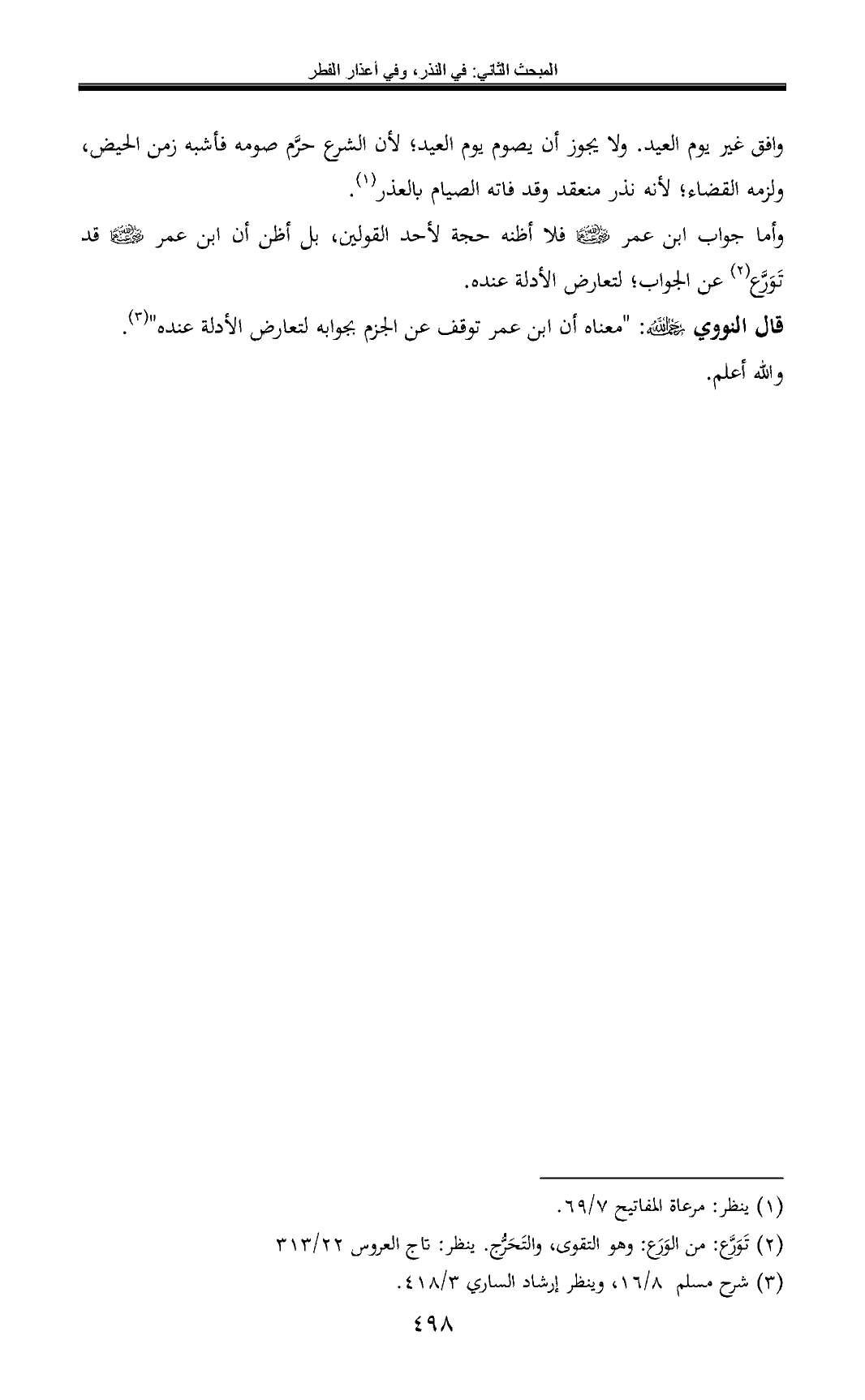 قال النووي: "معناه أن ابن عمر توقف عن الجزم بجوابه لتعارض الأدلة عنده" (¬3).