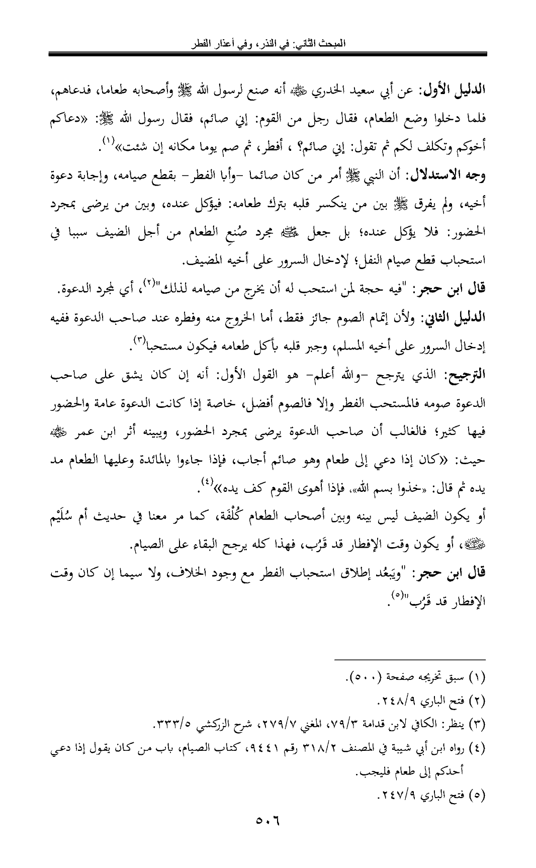 الترجيح: الذي يترجح -والله أعلم- هو القول الأول: أنه إن كان يشق على صاحب الدعوة صومه فالمستحب الفطر وإلا فالصوم أفضل, خاصة إذا كانت الدعوة عامة والحضور فيها كثير؛ فالغالب أن صاحب الدعوة يرضى بمجرد الحضور، ويبينه أثر ابن عمر - رضي الله عنه - حيث: «كان إذا دعي إلى طعام وهو صائم أجاب، فإذا جاءوا بالمائدة وعليها الطعام مد يده ثم قال: «خذوا بسم الله»، فإذا أهوى القوم كف يده» (¬4).