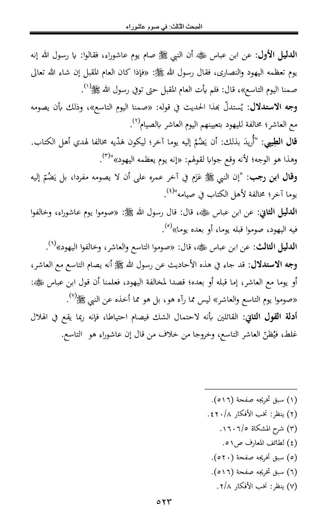 الدليل الثالث: عن ابن عباس - رضي الله عنه -، قال: «صوموا التاسع والعاشر, وخالفوا اليهود» (¬6).