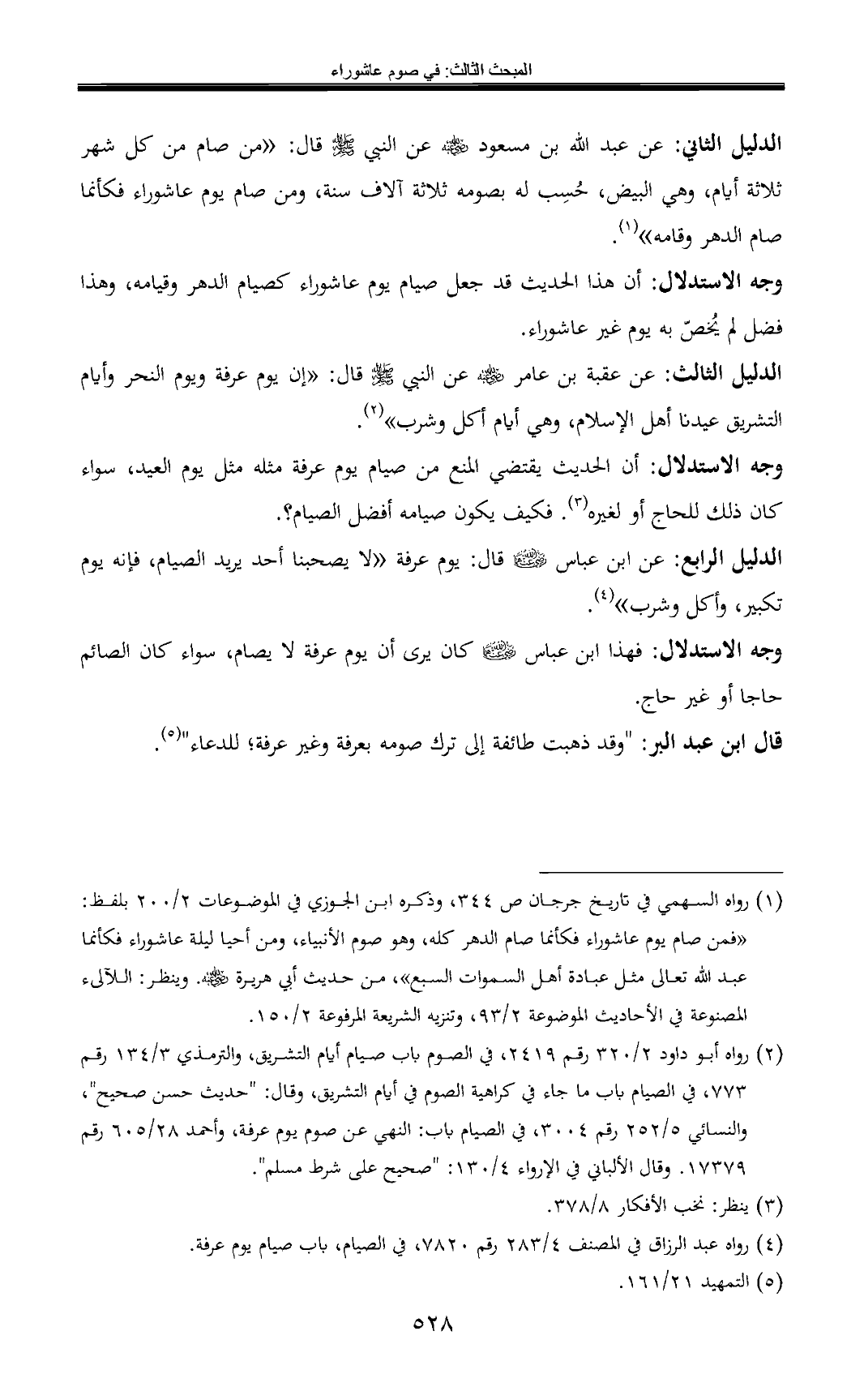 (¬2) رواه أبو داود 2/ 320 رقم 2419, في الصوم باب صيام أيام التشريق, والترمذي 3/ 134 رقم 773, في الصيام باب ما جاء في كراهية الصوم في أيام التشريق, وقال: "حديث حسن صحيح", والنسائي 5/ 252 رقم 3004, في الصيام باب: النهي عن صوم يوم عرفة, وأحمد 28/ 605 رقم 17379. وقال الألباني في الإرواء 4/ 130: "صحيح على شرط مسلم".