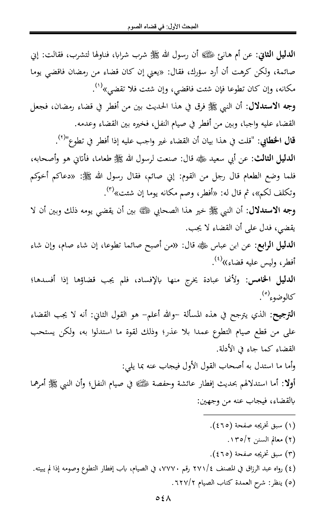 الدليل الثاني: عن أم هانئ - رضي الله عنها - أن رسول الله - صلى الله عليه وسلم - شرب شرابا، فناولها لتشرب، فقالت: إني صائمة، ولكن كرهت أن أرد سؤرك، فقال: «يعني إن كان قضاء من رمضان فاقضي يوما مكانه، وإن كان تطوعا فإن شئت فاقضي، وإن شئت فلا تقضي» (¬1).
