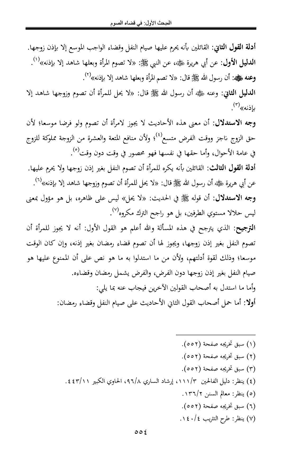 الدليل الأول: عن أبي هريرة - رضي الله عنه -، عن النبي - صلى الله عليه وسلم -: «لا تصوم المرأة وبعلها شاهد إلا بإذنه» (¬1).